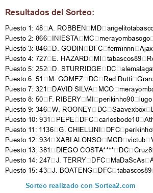 Lista de participantes: 41 M. NEUER POR carlosbode10 Ath. Bilbao, 43 J. BOATENG DFC tabascos89 Roma, 45 P. LAHM MCD TheForceMaker Alcorcon, 47 B. SCHWEINSTEIGER MC TheForceMaker Alcorcon, 48 A. ROBBEN MD angelitotabasco Fiorentina, 49 T. MULLER MD ulimoreno Juventus, 50 F. RIBERY MI perikinho90 lugo, 51 M. GOMEZ DC Red Dutti Granada, 62 M. HUMMELS DFC Xsamu Manchester United, 66 GOTZE MCO angelitotabasco Fiorentina, 74 R. LEWANDOWSKI DC adrylito Malaga, 79 M. REUS MI NandoBel78 Leganes, 112 J. FARFAN MD perikinho90 lugo, 114 K. HUNTELAAR DC carlosbode10 Ath. Bilbao, 145 M. MANDZUKIC DC igosling Barcelona, 244 P. CECH POR merayombasogo Boca Juniors, 247 J. TERRY DFC MaDaScAs Ac Milan, 252 D. STURRIDGE DC alemalaga94 benfica, 254 MATA MCO KaOs I AsTuR Tottenham, 256 DAVID LUIZ DFC sergiotabascos89 Real Madrid, 262 ALEX DFC alead71 Villarreal, 279 P. POGBA MC TheForceMaker Alcorcon, 301 S. GERRARD MCD Xsamu Manchester United, 305 L. SUAREZ DC angelitotabasco Fiorentina, 316 V. KOMPANY DFC sergiotabascos89 Real Madrid, 319 Y. TOURE MC pinolines Celtic, 321 DAVID SILVA MCO merayombasogo Boca Juniors, 322 S. NASRI MI lorenbb Betis, 323 S. AGÜERO DC perikinho90 Lugo, 324 C. TEVEZ DC x chachiquesi x Cordoba, 329 E. DZEKO DC MaDaScAs Ac Milan, 340 N. VIDIC DFC SSpecializeDD Manchester City, 346 W. ROONEY DC Saavexbox Las Palmas, 381 DIEGO COSTA**** DC Cruz8 Southend United, 414 L. MODRIC MC adrylito Malaga, 415 G. BALE MD ggio92 B. Leverkusen, 467 P. MERTESACKER DFC Saavexbox Las Palmas, 471 A. RAMSEY MC angelitotabasco Fiorentina, 474 R. VAN PERSIE DC merayombasogo Boca Juniors, 584 OSCAR MCO benniscuba Everton, 604 NEYMAR**** DC buijin Malaga, 609 LUCAS ED Demente MC Sevilla, 727 E. HAZARD MI tabascos89 Roma, 754 H. LLORIS POR ferminnn Ajax, 828 JAVI MARTINEZ DFC carlosbode10 Ath. Bilbao, 844 FALCAO DC perikinho90 Lugo, 846 D. GODIN DFC ferminnn Ajax, 859 DANI ALVES LD merayombasogo Boca Juniors, 861 PIQUE DFC MrMohamRam Espanyol, 863 SERGIO BUSQUETS MCD Crivi Llagostera, 864 XAVI MC tabascos89 Roma, 865 CESC FABREGAS MC lorenbb Betis, 866 INIESTA MC merayombasogo Boca Juniors, 867 L. MESSI MP adrylito Malaga, 870 J. MASCHERANO MCD perikinho90 Lugo, 871 A. SANCHEZ ED sergiotabascos89 Real Madrid, 873 PEDRO EI Cometheaven Elche, 897 J. TOULALAN MCD Yelko100 B. Dortmund, 900 SANTI CAZORLA MI MrMohamRam Espanyol, 906 ISCO MCO misterserpico Sounders, 929 CASILLAS POR sergiotabascos89 Real Madrid, 930 SERGIO RAMOS DFC angelitotabasco Fiorentina, 931 PEPE DFC carlosbode10 Ath. Bilbao, 934 XABI ALONSO MCD victub Valencia, 936 A. DI MARIA MCO ulimoreno Juventus, 937 CRISTIANO RONALDO EI TheForceMaker Alcorcon, 938 M. OZIL MCO misterserpico Sounders, 939 K. BENZEMA DC Saavexbox Las Palmas, 943 G. HIGUAIN DC alemalaga94 Benfica, 944 S. KHEDIRA MCD angelitotabasco Fiorentina, 971 JESUS NAVAS MD MrMohamRam Espanyol, 976 A. NEGREDO DC javitr Racing Santander, 979 I. RAKITIC MCO TATO XD Depor, 1028 THIAGO SILVA DFC ferminnn Ajax, 1035 Z. IBRAHIMOVIC DC crivi Llagostera, 1075 A. CANDREVA ED javitr Racing Santander, 1118 W. SNEIJDER MCO NandoBel78 Leganes, 1122 T. MOTTA MCD SSpecializeDD Manchester City, 1135 A. BARZAGLI DFC jesus022 Villarreal, 1136 G. CHIELLINI DFC perikinho90 Lugo, 1138 A. VIDAL MC alemalaga94 benfica, 1184 E. LAVEZZI EI Cometheaven Elche, 1185 E. CAVANI DC victub Valencia, 1217 M. PJANIC MC Havel7 Inter de Milan, 1254 JOAO MOUTINHO MC NandoBel78 Leganes, 1255 HULK ED NandoBel78 Leganes, 1259 JAMES RODRIGUEZ MCO victub Valencia, 1277 E. GARAY DFC Saavexbox Las Palmas, 1426 J. CUADRADO MD ulimoreno Juventus, 1724 DE ROSSI MCD adrylito Malaga, 1729 PIRLO MC Demente MC Sevilla, 1730 ERIKSEN MI lorenbb Betis, 1744 HAMSIK MCO Havel7 Inter de Milan, 1753 KROOS MC javitr Racing Santander, 1757 GUNDOGAN MC danygp89 Chelsea, 1766 MARCHISIO MC perikinho90 Lugo, 1784 T. COURTOIS POR Adriantr127 Arsenal, 1795 M. BENATIA DFC Adriantr127 Arsenal, 1796 MIRANDA DFC igosling Barcelona, 1797 MATUIDI MCD igosling Barcelona.