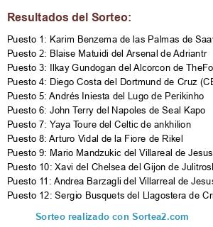 Lista de participantes: 1035 IBRAHIMOVIC, 937 C. RONALDO, 1028 THIAGO SILVA, 45 LAHM, 867 L. MESSI, 50 F. RIBERY, 844 FALCAO, 866 INIESTA, 864 XAVI, 474 R. VAN PERSIE, 48 A. ROBBEN, 47 B. SCHWEINSTEIGER, 340 N. VIDIC, 321 DAVID SILVA, 323 S. AGÜERO, 346 W. ROONEY, 1185 E. CAVANI, 938 M. OZIL, 415 G. BALE, 254 MATA, 41 M. NEUER, 936 A. DI MARIA, 316 V. KOMPANY, 324 C. TEVEZ, 1729 PIRLO, 861 PIQUE, 305 L. SUAREZ, 51 M. GOMEZ, 1136 G. CHIELLINI, 930 SERGIO RAMOS, 865 CESC FABREGAS, 319 Y. TOURE, 1133 G. BUFFON, 929 CASILLAS, 74 R. LEWANDOWSKI, 62 M. HUMMELS, 1184 E. LAVEZZI, 1138 A. VIDAL, 971 JESUS NAVAS, 900 SANTI CAZORLA, 66 M. GOTZE, 934 XABI ALONSO, 871 A. SANCHEZ, 727 E. HAZARD, 414 L.MODRIC, 49 T. MULLER, 939 K. BENZEMA, 863 SERGIO BUSQUETS, 248 A. COLE, 79 M. REUS, 873 PEDRO, 842 DIEGO, 1753 KROOS, 1255 HULK, 1238 A. DI NATALE, 1757 GUNDOGAN, 1087 R. MONTOLIVO, 944 S. KHEDIRA, 943 G. HIGUAIN, 870 J. MASCHERANO, 845 A. TURAN, 626 S. ETO´O, 604 NEYMAR, 342 NANI, 322 S. NASRI, 1766 MARCHISIO, 1744 HAMSIK, 1724 DE ROSSI, 1135 A. BARZAGLI, 1118 W. SNEIJDER, 1091 S. JOVETIC, 995 SOLDADO, 987 A. RAMI, 859 DANI ALVES, 828 JAVI MARTINEZ, 114 K. HUNTELAAR, 1784 T. COURTOIS, 1647 F. MARCHETTI, 1230 S. HANDANOVIC, 906 ISCO, 754 H. LLORIS, 640 I. AKINFEEV, 314 J. HART, 244 P. CECH, 78 DANTE, 25 R. ADLER, 253 D. DROGBA, 301 S. GERRARD, 1165 HERNANES, 416 R. VAN DER VAART, 356 A. VALENCIA, 339 R. FERDINAND, 67 S. KAGAWA, 1840 WILLIAN, 1722 DIAMANTI, 1254 JOAO MOUTINHO, 940 KAKA, 931 PEPE, 868 DAVID VILLA, 853 DIEGO COSTA, 470 A. SONG, 329 E. DZEKO, 73 J. BLASZCZYKOWSKI.