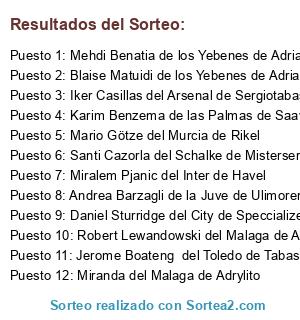 Lista de participantes: 1035 IBRAHIMOVIC, 937 C. RONALDO, 1028 THIAGO SILVA, 45 LAHM, 867 L. MESSI, 50 F. RIBERY, 844 FALCAO, 866 INIESTA, 864 XAVI, 474 R. VAN PERSIE, 48 A. ROBBEN, 47 B. SCHWEINSTEIGER, 340 N. VIDIC, 321 DAVID SILVA, 323 S. AGÜERO, 346 W. ROONEY, 1185 E. CAVANI, 938 M. OZIL, 415 G. BALE, 254 MATA, 41 M. NEUER, 936 A. DI MARIA, 316 V. KOMPANY, 324 C. TEVEZ, 1729 PIRLO, 861 PIQUE, 305 L. SUAREZ, 51 M. GOMEZ, 1136 G. CHIELLINI, 930 SERGIO RAMOS, 865 CESC FABREGAS, 319 Y. TOURE, 1133 G. BUFFON, 929 CASILLAS, 74 R. LEWANDOWSKI, 62 M. HUMMELS, 1184 E. LAVEZZI, 1138 A. VIDAL, 971 JESUS NAVAS, 900 SANTI CAZORLA, 66 M. GOTZE, 934 XABI ALONSO, 871 A. SANCHEZ, 727 E. HAZARD, 414 L.MODRIC, 49 T. MULLER, 939 K. BENZEMA, 863 SERGIO BUSQUETS, 248 A. COLE, 79 M. REUS, 873 PEDRO, 842 DIEGO, 1753 KROOS, 1255 HULK, 1238 A. DI NATALE, 1757 GUNDOGAN, 1087 R. MONTOLIVO, 944 S. KHEDIRA, 943 G. HIGUAIN, 870 J. MASCHERANO, 845 A. TURAN, 626 S. ETO´O, 604 NEYMAR, 342 NANI, 322 S. NASRI, 1766 MARCHISIO, 1744 HAMSIK, 1724 DE ROSSI, 1135 A. BARZAGLI, 1118 W. SNEIJDER, 1091 S. JOVETIC, 995 SOLDADO, 987 A. RAMI, 859 DANI ALVES, 828 JAVI MARTINEZ, 114 K. HUNTELAAR, 1784 T. COURTOIS, 1647 F. MARCHETTI, 1230 S. HANDANOVIC, 906 ISCO, 754 H. LLORIS, 640 I. AKINFEEV, 314 J. HART, 244 P. CECH, 78 DANTE, 25 R. ADLER, 253 D. DROGBA, 301 S. GERRARD, 1165 HERNANES, 416 R. VAN DER VAART, 356 A. VALENCIA, 339 R. FERDINAND, 67 S. KAGAWA, 1840 WILLIAN, 1722 DIAMANTI, 1254 JOAO MOUTINHO, 940 KAKA, 931 PEPE, 868 DAVID VILLA, 853 DIEGO COSTA, 470 A. SONG, 329 E. DZEKO, 73 J. BLASZCZYKOWSKI.