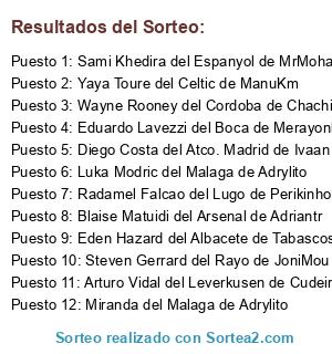 Lista de participantes: 1035 IBRAHIMOVIC, 937 C. RONALDO, 1028 THIAGO SILVA, 45 LAHM, 867 L. MESSI, 50 F. RIBERY, 844 FALCAO, 866 INIESTA, 864 XAVI, 474 R. VAN PERSIE, 48 A. ROBBEN, 47 B. SCHWEINSTEIGER, 340 N. VIDIC, 321 DAVID SILVA, 323 S. AGÜERO, 346 W. ROONEY, 1185 E. CAVANI, 938 M. OZIL, 415 G. BALE, 254 MATA, 41 M. NEUER, 936 A. DI MARIA, 316 V. KOMPANY, 324 C. TEVEZ, 1729 PIRLO, 861 PIQUE, 305 L. SUAREZ, 51 M. GOMEZ, 1136 G. CHIELLINI, 930 SERGIO RAMOS, 865 CESC FABREGAS, 319 Y. TOURE, 1133 G. BUFFON, 929 CASILLAS, 74 R. LEWANDOWSKI, 62 M. HUMMELS, 1184 E. LAVEZZI, 1138 A. VIDAL, 971 JESUS NAVAS, 900 SANTI CAZORLA, 66 M. GOTZE, 934 XABI ALONSO, 871 A. SANCHEZ, 727 E. HAZARD, 414 L.MODRIC, 49 T. MULLER, 939 K. BENZEMA, 863 SERGIO BUSQUETS, 248 A. COLE, 79 M. REUS, 873 PEDRO, 842 DIEGO, 1753 KROOS, 1255 HULK, 1238 A. DI NATALE, 1757 GUNDOGAN, 1087 R. MONTOLIVO, 944 S. KHEDIRA, 943 G. HIGUAIN, 870 J. MASCHERANO, 845 A. TURAN, 626 S. ETO´O, 604 NEYMAR, 342 NANI, 322 S. NASRI, 1766 MARCHISIO, 1744 HAMSIK, 1724 DE ROSSI, 1135 A. BARZAGLI, 1118 W. SNEIJDER, 1091 S. JOVETIC, 995 SOLDADO, 987 A. RAMI, 859 DANI ALVES, 828 JAVI MARTINEZ, 114 K. HUNTELAAR, 1784 T. COURTOIS, 1647 F. MARCHETTI, 1230 S. HANDANOVIC, 906 ISCO, 754 H. LLORIS, 640 I. AKINFEEV, 314 J. HART, 244 P. CECH, 78 DANTE, 25 R. ADLER, 253 D. DROGBA, 301 S. GERRARD, 1165 HERNANES, 416 R. VAN DER VAART, 356 A. VALENCIA, 339 R. FERDINAND, 67 S. KAGAWA, 1840 WILLIAN, 1722 DIAMANTI, 1254 JOAO MOUTINHO, 940 KAKA, 931 PEPE, 868 DAVID VILLA, 853 DIEGO COSTA, 470 A. SONG, 329 E. DZEKO, 73 J. BLASZCZYKOWSKI.