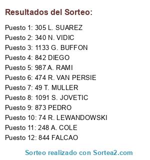 Lista de participantes: Steven Gerrard del Rayo de JoniMou, Mario Gomez del Milan de Cipriano, Alex del Villarreal de Jesus022, Eduardo Lavezzi del Boca de Merayonbasogo, Thiago Motta del Villarreal de Jesus022, David Luiz del R. Madrid de Sergiotabascos, Lucas del Leganes de Nandobel, Antonio Candreva del Boca de Merayonbasogo, Claudio Marchisio de la Juve de Ulimoreno, Marek Hamsik del Inter de Havel, Andrea Barzagli de la Juve de Ulimoreno, Nemanja Vidic del City de Specializedd, Hulk del Benfica de Alemalaga, Per Mertesacker del Rayo de JonyMou, John Terry del Napoles de Seal Kapo, Jefferson Farfan del Sounders de Mistersepico, Daniel Sturridge del City de Speccializedd, Edwin Dzeko del Espanyol de MrMohamRam, Negredo del Villarreal de Jesus022, Jesus Navas del Espanyol de MrMohamRam, Ilkay Gundogan del Alcorcon de TheForceMaker, Christian Eriksen del Monaco de Javitr, Aaron Ramsey del R. Madrid de Nandobel, Isco del Villarreal de Jesus022, Pedro del R. Madrid de Sergiotabascos, Mario Mandzukic del Villareal de Jesus022, Ivan Rakitic del Albacete de Tabascos, Blaise Matuidi del Arsenal de Adriantr, Miranda del Malaga de Adrylito, Ezekiel Garay del Villarreal de Jesus022, Joao Moutinho del Leganes de Nandobel, Dani Alves del Albacete de Tabascos, Javier Mascherano del Lugo de Perikinho, Jeremy Toulalan del Rayo de Charlyperezrey, Pepe del Ath. Bilbao de Carlosbode, Paul Pogba del Vitesse de Jesub, Juan Cuadrado de la Juve de Ulimoreno, Miralem Pjanic del Inter de Havel, Gonzalo Higuain del Nacional de Adizero1drose, Klaas-Jan Huntelaar del Ath. Bilbao de Carlosbode, Danniele de Rossi del Malaga de Adrylito, Wesley Sneijder del Benfica de Alemalaga, Oscar de la Fiore de Rikel, Alexis Sanchez del Everton de Marcoss1, Samir Nasri de las Palmas de Saavexbox, Santi Cazorla del Sounders de Misterserpico, Mehdi Benatia de los Yebenes de Adriantr, Diego Godin del Ajax de Fermin, Sami Khedira del Espanyol de MrMohamRam, Gerard Pique del Espanyol de MrMohamRam, Giorgio Chiellini de las Palmas de Saavexbox, Andrea Pirlo del Everton de Marcoss1, Xabi Alonso del Valencia de Victub, Iker Casillas del R. Madrid de Sergiotabascos, Cesc Fabregas del Betis de Lorenbetico, Hugo Lloris del Psg de Javitr, Javi Martinez del Ath. Bilbao de Carlosbode, Sergio Busquets del Llagostera de Crivi, Jerome Boateng del Albacete de Tabascos, Juan Mata del Boca de Merayonbasogo, Karim Benzema de las Palmas de Saavexbox, Carlos Tevez del Cordoba de Chachiquesi, Mario Götze del Murcia de Rikel, Diego Costa del Atco. Madrid de Ivaan, Toni Kroos del Betis de Lorenbetico, Arturo Vidal del Leverkusen de Cudeiro, Petr Cech de las Palmas de Saavexbox, Edinson Cavani del Valencia de Victub, James Rodríguez del Valencia de Victub, Thibaut Courtois del Arsenal de Adriantr, Neymar del Dortmund de Cruz, Mats Hummels del Everton de Marcoss1, Mesut Ozil del Celtic de Ankhilion, Thomas Muller de la Juve de Ulimoreno, Marco Reus del Leganes de Nandobel, Angel Di Maria de la Juve de Ulimoreno, Sergio Aguero del Lugo de Perikinho, Wayne Rooney del Cordoba de Chachiquesi, Yaya Toure del Celtic de ManuKm, Xavi del Chelsea de Escrich, Vincent Kompany del Boca de merayonbasoyo, Robert Lewandowski del Malaga de Adrylito, Luka Modric del Malaga de Adrylito, David Silva del Valencia de Victub, Thiago Silva del Ajax de Fermin, Sergio Ramos de la Fiore de Rikel, Gareth Bale del Leverkusen de Cudeiro, Philipp Lahm del Llagostera de Crivi, Radamel Falcao del Lugo de Perikinho, Robin van Persie del Cordoba de Chachiquesi, Eden Hazard del Albacete de Tabascos, Franck Ribéry del Napoles de Seal Kapo, Bastian Schweinsteiger del Betis de Lorenbetico, Luis Suárez de la Fiore de Rikel, Andrés Iniesta del Lugo de Perikinho, Manuel Neuer del Ath. Bilbao de Carlosbode, Zlatan Ibrahimovic del Malaga de Adrylito, Arjen Robben del Everton de Marcoss1, Cristiano Ronaldo del Alcorcon de TheForceMaker, Lionei Messi del Llagostera de Crivi.