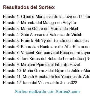 Lista de participantes: Steven Gerrard del Rayo de Pablotp84, Mario Gomez del Gijon de JulitrosMartin, Alex del Villarreal de Jesus022, Eduardo Lavezzi del Boca de Merayonbasogo, Thiago Motta del Villarreal de Jesus022, David Luiz del R. Madrid de Sergiotabascos, Lucas del Leganes de Nandobel, Antonio Candreva del Boca de Merayonbasogo, Claudio Marchisio de la Juve de Ulimoreno, Marek Hamsik del Inter de Havel, Andrea Barzagli del Villarreal de Jesus022, Nemanja Vidic del City de Specializedd, Hulk del Benfica de Alemalaga, Per Mertesacker del Rayo de JonyMou, John Terry del Napoles de Seal Kapo, Jefferson Farfan del Sounders de Mistersepico, Daniel Sturridge del City de Speccializedd, Edwin Dzeko del Nacional de Adizero1drose, Negredo del Villarreal de Jesus022, Jesus Navas del Espanyol de MrMohamRam, Ilkay Gundogan del Alcorcon de TheForceMaker, Christian Eriksen del Betis de Lorenbetico, Aaron Ramsey del R. Madrid de Nandobel, Isco del Villarreal de Jesus022, Pedro del Everton de Marcoss1, Mario Mandzukic del Villareal de Jesus022, Ivan Rakitic del Albacete de Tabascos, Blaise Matuidi del Arsenal de Adriantr, Miranda del Malaga de Adrylito, Ezekiel Garay del Psg de Javitr, Joao Moutinho del Leganes de Nandobel, Dani Alves del Albacete de Tabascos, Javier Mascherano del Lugo de Perikinho, Jeremy Toulalan del Rayo de Charlyperezrey, Pepe del Ath. Bilbao de Carlosbode, Paul Pogba del Malaga de Adrylito, Juan Cuadrado de la Juve de Ulimoreno, Miralem Pjanic del Inter de Havel, Gonzalo Higuain del Nacional de Adizero1drose, Klaas-Jan Huntelaar del Ath. Bilbao de Carlosbode, Danniele de Rossi del Malaga de Adrylito, Wesley Sneijder del Benfica de Alemalaga, Oscar de la Fiore de Rikel, Alexis Sanchez del R. Madrid de sergiotabascos, Samir Nasri del Betis de Lorenbetico, Santi Cazorla del Sounders de Misterserpico, Mehdi Benatia de los Yebenes de Adriantr, Diego Godin del Ajax de Fermin, Sami Khedira del Dortmund de Cruz, Gerard Pique del Espanyol de MrMohamRam, Giorgio Chiellini de las Palmas de Saavexbox, Andrea Pirlo del Everton de Marcoss1, Xabi Alonso del Valencia de Victub, Iker Casillas del R. Madrid de Sergiotabascos, Cesc Fabregas del Betis de Lorenbetico, Hugo Lloris del Psg de Javitr, Javi Martinez del Ath. Bilbao de Carlosbode, Sergio Busquets del Llagostera de Crivi, Jerome Boateng del Albacete de Tabascos, Juan Mata del Boca de Merayonbasogo, Karim Benzema de las Palmas de Saavexbox, Carlos Tevez del Cordoba de Chachiquesi, Mario Götze del Murcia de Rikel, Diego Costa del Dortmund de Cruz (CEDIDO), Toni Kroos del Betis de Lorenbetico (NO ESTA EN NINGUN EQUIPO), Arturo Vidal de la Fiore de Rikel, Petr Cech de las Palmas de Saavexbox, Edinson Cavani del Valencia de Victub, James Rodríguez del Valencia de Victub, Thibaut Courtois del Arsenal de Adriantr, Neymar del Atco. Madrid de Ivaan (CEDIDO), Mats Hummels del United de XSamu, Mesut Ozil del Español de MrMohamRam, Thomas Muller de la Juve de Ulimoreno, Marco Reus del Leganes de Nandobel, Angel Di Maria de la Juve de Ulimoreno, Sergio Aguero del Lugo de Perikinho, Wayne Rooney del Llagostera de Crivi, Yaya Toure del Celtic de ankhilion, Xavi del Chelsea del Gijon de JulitrosMartin, Vincent Kompany del Boca de merayonbasoyo, Robert Lewandowski del Malaga de Adrylito, Luka Modric del Malaga de Adrylito, David Silva del Valencia de Victub, Thiago Silva del Ajax de Fermin, Sergio Ramos de la Fiore de Rikel, Gareth Bale del Leverkusen de Cudeiro, Philipp Lahm del Llagostera de Crivi, Radamel Falcao del Lugo de Perikinho, Robin van Persie del Cordoba de Chachiquesi, Eden Hazard del Albacete de Tabascos, Franck Ribéry del Toledo de Tabascos, Bastian Schweinsteiger del City de SSpecializedd, Luis Suárez de la Fiore de Rikel, Andrés Iniesta del Lugo de Perikinho, Manuel Neuer del Ath. Bilbao de Carlosbode, Zlatan Ibrahimovic del Malaga de Adrylito, Arjen Robben del Everton de Marcoss1, Cristiano Ronaldo del Alcorcon de TheForceMaker, Lionei Messi del Llagostera de Crivi.