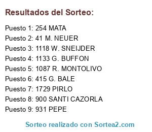 Lista de participantes: 867 L. MESSI, 50 F. RIBERY, 844 FALCAO, 866 INIESTA, 864 XAVI, 474 R. VAN PERSIE, 48 A. ROBBEN, 47 B. SCHWEINSTEIGER, 340 N. VIDIC, 321 DAVID SILVA, 323 S. AGÜERO, 346 W. ROONEY, 1185 E. CAVANI, 938 M. OZIL, 415 G. BALE, 254 MATA, 41 M. NEUER, 936 A. DI MARIA, 316 V. KOMPANY, 324 C. TEVEZ, 1729 PIRLO, 861 PIQUE, 305 L. SUAREZ, 51 M. GOMEZ, 1136 G. CHIELLINI, 930 SERGIO RAMOS, 865 CESC FABREGAS, 319 Y. TOURE, 1133 G. BUFFON, 929 CASILLAS, 74 R. LEWANDOWSKI, 62 M. HUMMELS, 1184 E. LAVEZZI, 1138 A. VIDAL, 971 JESUS NAVAS, 900 SANTI CAZORLA, 66 M. GOTZE, 934 XABI ALONSO, 871 A. SANCHEZ, 727 E. HAZARD, 414 L.MODRIC, 49 T. MULLER, 939 K. BENZEMA, 863 SERGIO BUSQUETS, 248 A. COLE, 79 M. REUS, 873 PEDRO, 842 DIEGO, 1753 KROOS, 1255 HULK, 1238 A. DI NATALE, 1757 GUNDOGAN, 1087 R. MONTOLIVO, 944 S. KHEDIRA, 943 G. HIGUAIN, 870 J. MASCHERANO, 845 A. TURAN, 626 S. ETO´O, 604 NEYMAR, 342 NANI, 322 S. NASRI, 1766 MARCHISIO, 1744 HAMSIK, 1724 DE ROSSI, 1135 A. BARZAGLI, 1118 W. SNEIJDER, 1091 S. JOVETIC, 995 SOLDADO, 987 A. RAMI, 859 DANI ALVES, 828 JAVI MARTINEZ, 114 K. HUNTELAAR, 1784 T. COURTOIS, 1647 F. MARCHETTI, 1230 S. HANDANOVIC, 906 ISCO, 754 H. LLORIS, 640 I. AKINFEEV, 314 J. HART, 244 P. CECH, 78 DANTE, 25 R. ADLER, 253 D. DROGBA, 301 S. GERRARD, 1165 HERNANES, 416 R. VAN DER VAART, 356 A. VALENCIA, 339 R. FERDINAND, 67 S. KAGAWA, 1840 WILLIAN, 1722 DIAMANTI, 1254 JOAO MOUTINHO, 940 KAKA, 931 PEPE, 868 DAVID VILLA, 853 DIEGO COSTA, 470 A. SONG, 329 E. DZEKO, 73 J. BLASZCZYKOWSKI.
