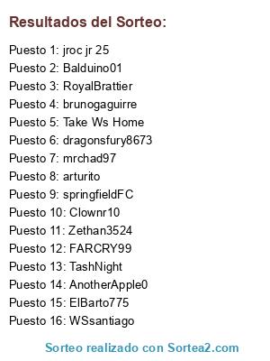 Lista de participantes: RoyalBrattier, ElBarto775, mrchad97, FARCRY99, Take Ws Home, Clownr10, TashNight, Balduino01, springfieldFC, jroc jr 25, dragonsfury8673, brunogaguirre, arturito, WSsantiago, Zethan3524, AnotherApple0.