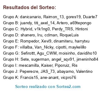Lista de participantes: Sete, Van_Nicky, titi_axel_14, Perdy_TRS, Raimon_13, moisinho, danicanario, dinamiteru, cclman, Duarte7, Ris, Artero, Francis15, juandy, JAS_73, maykelillo, gores19, Xevi9, RoqueLuis, villalba, Hintoni, Piporuiz, Kaiser, Rompedor, harrytxu, Valentino, Hybrid, davidiho10, Agu_CWM, mescamilla, angel_sqv91, a69tepongo, cipotti, Iru, shanero, ane-anant, Peperecre, Sefirottt, v1k1ng0, sugerman, abayamo, jimeninho84, vicpro76.