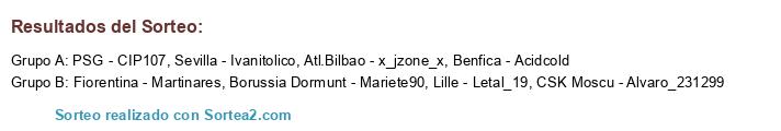 Lista de participantes: Borussia Dormunt - Mariete90, PSG - CIP107, Lille - Letal_19, Benfica - Acidcold, CSK Moscu - Alvaro_231299, Atl.Bilbao - x_jzone_x, Fiorentina - Martinares, Sevilla - Ivanitolico.