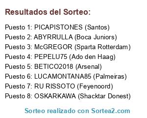 Lista de participantes: BETICO2018 (Arsenal), PICAPISTONES (Santos), LUCAMONTANA85 (Palmeiras), OSKARKAWA (Shacktar Donest), McGREGOR (Sparta Rotterdam), PEPELU75 (Ado den Haag), ABYRRULLA (Boca Juniors), RU RISSOTO (Feyenoord).
