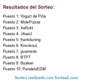 Lista de participantes: MidePizzas, JAxelJ, Yogurt de Piña, ParaleloEDM, frankituning, guamedo, SrRosaFosforito, Byaken, Knockout., BTPT, XeRoN, CarlosStilo.