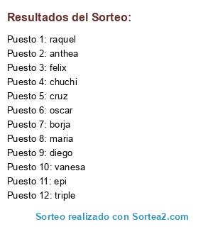 Lista de participantes: epi, cruz, diego, oscar, maria, felix, anthea, chuchi, raquel, vanesa, borja, triple.
