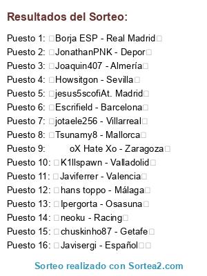 Lista de participantes: Howsitgon - Sevilla , Javiferrer - Valencia , Borja ESP - Real Madrid , JonathanPNK - Depor , chuskinho87 - Getafe , jotaele256 - Villarreal , Escrifield - Barcelona , K1llspawn - Valladolid , Tsunamy8 - Mallorca , jesus5scofiAt. Madrid , oX Hate Xo - Zaragoza , Joaquin407 - Almería , hans toppo - Málaga , Ipergorta - Osasuna , Javisergi - Español , neoku - Racing.