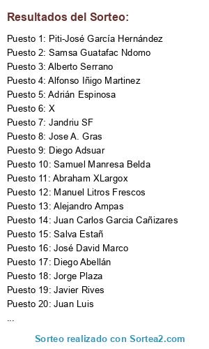 Lista de participantes: José David Marco, Javier Rives, Salva Estañ, Alejandro Ampas, Diego Adsuar, Piti-José García Hernández, Jandriu SF, Abraham XLargox, Jose A. Gras, Manuel Litros Frescos, Alberto Serrano, Threeidiots Yxz, Alfonso Iñigo Martinez, Juan Carlos Garcia Cañizares, Samuel Manresa Belda, Diego Abellán, Jesus Maria Lopez Ruiz, Jesus Manresa, Samsa Guatafac Ndomo, Jorge Plaza, Adrián Espinosa, Pedro Lapaz Sanchez, Juan Luis, X.
