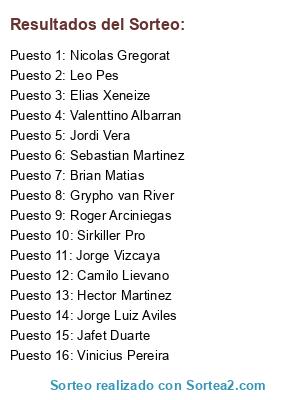 Lista de participantes: Roger Arciniegas, Jordi Vera, Jorge Vizcaya, Brian Matias, Grypho van River, Jorge Luiz Aviles, Nicolas Gregorat, Sirkiller Pro, Valenttino Albarran, Sebastian Martinez, Vinicius Pereira, Hector Martinez, Camilo Lievano, Leo Pes, Elias Xeneize, Jafet Duarte.