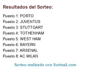 Lista de participantes: AC MILAN, JUVENTUS, ARSENAL, PORTO, WEST HAM, TOTHENHAM, STUTTGART, BAYERN.