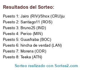 Lista de participantes: Perico (MIN), hincha de verdad (LAN), Santiago11 (ROS), Morens (COR), Bruno25 (IND), Teeka (ATN), Guusfraba (BOC), Jairo (RIV)/Shox (CRU)ju.