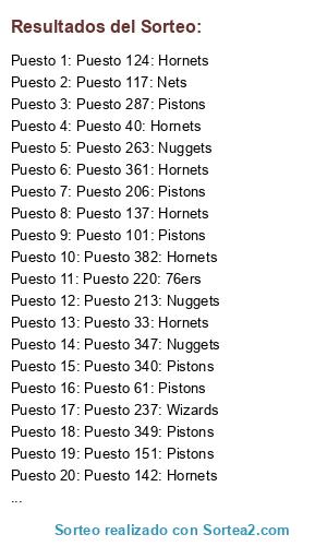Lista de participantes: Puesto 1: Pistons, Puesto 2: Nets, Puesto 3: Wizards, Puesto 4: Raptors, Puesto 5: 76ers, Puesto 6: Pistons, Puesto 7: Pistons, Puesto 8: Pistons, Puesto 9: Pistons, Puesto 10: Wizards, Puesto 11: Pistons, Puesto 12: Pistons, Puesto 13: Nets, Puesto 14: Raptors, Puesto 15: 76ers, Puesto 16: Pistons, Puesto 17: Pistons, Puesto 18: Hornets, Puesto 19: Raptors, Puesto 20: 76ers, Puesto 21: Pistons, Puesto 22: Pistons, Puesto 23: Raptors, Puesto 24: Pistons, Puesto 25: Nets, Puesto 26: Nets, Puesto 27: Hornets, Puesto 28: Pistons, Puesto 29: Pistons, Puesto 30: Pistons, Puesto 31: Nuggets, Puesto 32: Pistons, Puesto 33: Hornets, Puesto 34: Pistons, Puesto 35: Pistons, Puesto 36: Pistons, Puesto 37: Raptors, Puesto 38: Hornets, Puesto 39: Pistons, Puesto 40: Hornets, Puesto 41: Pistons, Puesto 42: Pistons, Puesto 43: Pistons, Puesto 44: 76ers, Puesto 45: Wizards, Puesto 46: Pistons, Puesto 47: Pistons, Puesto 48: Raptors, Puesto 49: 76ers, Puesto 50: 76ers, Puesto 51: Pistons, Puesto 52: Pistons, Puesto 53: Raptors, Puesto 54: Nuggets, Puesto 55: Nuggets, Puesto 56: Wizards, Puesto 57: Wizards, Puesto 58: Pistons, Puesto 59: Pistons, Puesto 60: Pistons, Puesto 61: Pistons, Puesto 62: Hornets, Puesto 63: Nuggets, Puesto 64: Nets, Puesto 65: Nuggets, Puesto 66: Pistons, Puesto 67: 76ers, Puesto 68: Nets, Puesto 69: Raptors, Puesto 70: Pistons, Puesto 71: Pistons, Puesto 72: 76ers, Puesto 73: Wizards, Puesto 74: Raptors, Puesto 75: Pistons, Puesto 76: 76ers, Puesto 77: Pistons, Puesto 78: Pistons, Puesto 79: Raptors, Puesto 80: Pistons, Puesto 81: Hornets, Puesto 82: Pistons, Puesto 83: Pistons, Puesto 84: Nuggets, Puesto 85: 76ers, Puesto 86: Pistons, Puesto 87: Pistons, Puesto 88: Pistons, Puesto 89: Pistons, Puesto 90: 76ers, Puesto 91: Nets, Puesto 92: Raptors, Puesto 93: Pistons, Puesto 94: Nets, Puesto 95: Pistons, Puesto 96: Wizards, Puesto 97: Nuggets, Puesto 98: Pistons, Puesto 99: Nets, Puesto 100: Pistons, Puesto 101: Pistons, Puesto 102: Pistons, Puesto 103: Hornets, Puesto 104: Raptors, Puesto 105: Pistons, Puesto 106: Pistons, Puesto 107: Pistons, Puesto 108: Pistons, Puesto 109: Nuggets, Puesto 110: Pistons, Puesto 111: Raptors, Puesto 112: 76ers, Puesto 113: Raptors, Puesto 114: Pistons, Puesto 115: Nuggets, Puesto 116: Pistons, Puesto 117: Nets, Puesto 118: Hornets, Puesto 119: Pistons, Puesto 120: Pistons, Puesto 121: Raptors, Puesto 122: 76ers, Puesto 123: Wizards, Puesto 124: Hornets, Puesto 125: Pistons, Puesto 126: Nuggets, Puesto 127: Raptors, Puesto 128: Pistons, Puesto 129: Pistons, Puesto 130: Pistons, Puesto 131: Nets, Puesto 132: Pistons, Puesto 133: Nets, Puesto 134: Pistons, Puesto 135: Nets, Puesto 136: Nets, Puesto 137: Hornets, Puesto 138: Nets, Puesto 139: Wizards, Puesto 140: Pistons, Puesto 141: Pistons, Puesto 142: Hornets, Puesto 143: Pistons, Puesto 144: Hornets, Puesto 145: Pistons, Puesto 146: Nuggets, Puesto 147: Nuggets, Puesto 148: 76ers, Puesto 149: Pistons, Puesto 150: Pistons, Puesto 151: Pistons, Puesto 152: Nets, Puesto 153: Pistons, Puesto 154: Nuggets, Puesto 155: Pistons, Puesto 156: Nuggets, Puesto 157: Nuggets, Puesto 158: Hornets, Puesto 159: Pistons, Puesto 160: Hornets, Puesto 161: 76ers, Puesto 162: Pistons, Puesto 163: Pistons, Puesto 164: Pistons, Puesto 165: Wizards, Puesto 166: Pistons, Puesto 167: Pistons, Puesto 168: Nuggets, Puesto 169: Hornets, Puesto 170: Pistons, Puesto 171: Pistons, Puesto 172: Pistons, Puesto 173: Raptors, Puesto 174: 76ers, Puesto 175: Pistons, Puesto 176: Nets, Puesto 177: Pistons, Puesto 178: Nuggets, Puesto 179: Wizards, Puesto 180: Raptors, Puesto 181: Hornets, Puesto 182: Nuggets, Puesto 183: Nets, Puesto 184: Pistons, Puesto 185: Raptors, Puesto 186: Pistons, Puesto 187: Nets, Puesto 188: Nets, Puesto 189: Hornets, Puesto 190: 76ers, Puesto 191: Pistons, Puesto 192: Raptors, Puesto 193: 76ers, Puesto 194: Pistons, Puesto 195: Pistons, Puesto 196: Nets, Puesto 197: Pistons, Puesto 198: Pistons, Puesto 199: Hornets, Puesto 200: Pistons, Puesto 201: Hornets, Puesto 202: Wizards, Puesto 203: Pistons, Puesto 204: Pistons, Puesto 205: Raptors, Puesto 206: Pistons, Puesto 207: Hornets, Puesto 208: Raptors, Puesto 209: Pistons, Puesto 210: Pistons, Puesto 211: Pistons, Puesto 212: Pistons, Puesto 213: Nuggets, Puesto 214: Nuggets, Puesto 215: Nets, Puesto 216: Nuggets, Puesto 217: Raptors, Puesto 218: Nets, Puesto 219: Pistons, Puesto 220: 76ers, Puesto 221: 76ers, Puesto 222: Pistons, Puesto 223: Pistons, Puesto 224: Nets, Puesto 225: Nuggets, Puesto 226: Pistons, Puesto 227: Hornets, Puesto 228: Hornets, Puesto 229: Nets, Puesto 230: Pistons, Puesto 231: Pistons, Puesto 232: Pistons, Puesto 233: Pistons, Puesto 234: Nuggets, Puesto 235: Pistons, Puesto 236: 76ers, Puesto 237: Wizards, Puesto 238: Pistons, Puesto 239: Nuggets, Puesto 240: Pistons, Puesto 241: Pistons, Puesto 242: Pistons, Puesto 243: Pistons, Puesto 244: 76ers, Puesto 245: 76ers, Puesto 246: 76ers, Puesto 247: 76ers, Puesto 248: Nuggets, Puesto 249: Wizards, Puesto 250: Wizards, Puesto 251: Nuggets, Puesto 252: Pistons, Puesto 253: Hornets, Puesto 254: Pistons, Puesto 255: Hornets, Puesto 256: Raptors, Puesto 257: Nets, Puesto 258: Pistons, Puesto 259: Pistons, Puesto 260: 76ers, Puesto 261: Pistons, Puesto 262: Nets, Puesto 263: Nuggets, Puesto 264: Pistons, Puesto 265: Hornets, Puesto 266: Hornets, Puesto 267: Pistons, Puesto 268: Hornets, Puesto 269: Pistons, Puesto 270: Wizards, Puesto 271: Wizards, Puesto 272: Raptors, Puesto 273: 76ers, Puesto 274: Pistons, Puesto 275: Pistons, Puesto 276: Nets, Puesto 277: Pistons, Puesto 278: Hornets, Puesto 279: 76ers, Puesto 280: Pistons, Puesto 281: Pistons, Puesto 282: Pistons, Puesto 283: Nets, Puesto 284: Raptors, Puesto 285: Pistons, Puesto 286: Pistons, Puesto 287: Pistons, Puesto 288: Nets, Puesto 289: Nets, Puesto 290: 76ers, Puesto 291: Nuggets, Puesto 292: Pistons, Puesto 293: Hornets, Puesto 294: Nets, Puesto 295: Hornets, Puesto 296: Pistons, Puesto 297: Wizards, P