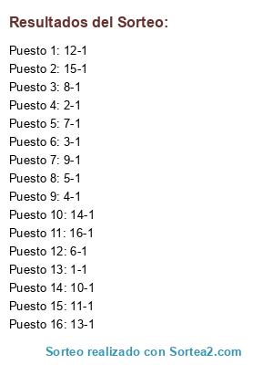 Lista de participantes: 1-1, 2-1, 3-1, 4-1, 5-1, 6-1, 7-1, 8-1, 9-1, 10-1, 11-1, 12-1, 13-1, 14-1, 15-1, 16-1.