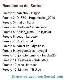 Lista de participantes: Linmer - Niickoo, D1E60 - Hugonicolas_2040, dyegoandres - dyegol, Felipe_pinto - Pellejunior, Lalitovilla - SANTANA, danielilllo - djmikeko, Clarkkent1-borisdiego, wee- bardock, jona.fenomeno - Nicolas23, fnatic - franx, Cris14 - Feliu, coqe - kurosaki, naninho - Turgon.