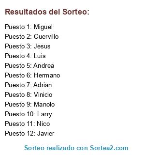 Lista de participantes: Nico, Larry, Javier, Cuervillo, Vinicio, Hermano, Manolo, Luis, Andrea, Miguel, Adrian, Jesus.
