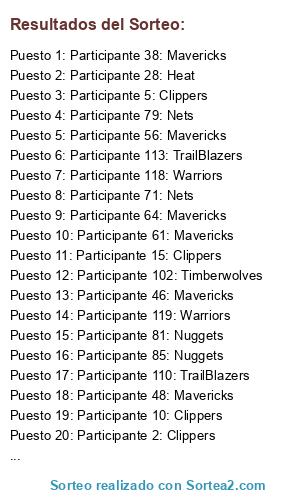 Lista de participantes: Participante 1: Clippers, Participante 2: Clippers, Participante 3: Clippers, Participante 4: Clippers, Participante 5: Clippers, Participante 6: Clippers, Participante 7: Clippers, Participante 8: Clippers, Participante 9: Clippers, Participante 10: Clippers, Participante 11: Clippers, Participante 12: Clippers, Participante 13: Clippers, Participante 14: Clippers, Participante 15: Clippers, Participante 16: Clippers, Participante 17: Clippers, Participante 18: Clippers, Participante 19: Grizzlies, Participante 20: Grizzlies, Participante 21: Grizzlies, Participante 22: Grizzlies, Participante 23: Grizzlies, Participante 24: Heat, Participante 25: Heat, Participante 26: Heat, Participante 27: Heat, Participante 28: Heat, Participante 29: Lakers, Participante 30: Lakers, Participante 31: Lakers, Participante 32: Lakers, Participante 33: Lakers, Participante 34: Lakers, Participante 35: Mavericks, Participante 36: Mavericks, Participante 37: Mavericks, Participante 38: Mavericks, Participante 39: Mavericks, Participante 40: Mavericks, Participante 41: Mavericks, Participante 42: Mavericks, Participante 43: Mavericks, Participante 44: Mavericks, Participante 45: Mavericks, Participante 46: Mavericks, Participante 47: Mavericks, Participante 48: Mavericks, Participante 49: Mavericks, Participante 50: Mavericks, Participante 51: Mavericks, Participante 52: Mavericks, Participante 53: Mavericks, Participante 54: Mavericks, Participante 55: Mavericks, Participante 56: Mavericks, Participante 57: Mavericks, Participante 58: Mavericks, Participante 59: Mavericks, Participante 60: Mavericks, Participante 61: Mavericks, Participante 62: Mavericks, Participante 63: Mavericks, Participante 64: Mavericks, Participante 65: Mavericks, Participante 66: Mavericks, Participante 67: Mavericks, Participante 68: Nets, Participante 69: Nets, Participante 70: Nets, Participante 71: Nets, Participante 72: Nets, Participante 73: Nets, Participante 74: Nets, Participante 75: Nets, Participante 76: Nets, Participante 77: Nets, Participante 78: Nets, Participante 79: Nets, Participante 80: Nuggets, Participante 81: Nuggets, Participante 82: Nuggets, Participante 83: Nuggets, Participante 84: Nuggets, Participante 85: Nuggets, Participante 86: Nuggets, Participante 87: Raptors, Participante 88: Raptors, Participante 89: Raptors, Participante 90: Raptors, Participante 91: Raptors, Participante 92: Raptors, Participante 93: Raptors, Participante 94: Raptors, Participante 95: Raptors, Participante 96: Raptors, Participante 97: Raptors, Participante 98: Raptors, Participante 99: Raptors, Participante 100: Raptors, Participante 101: Timberwolves, Participante 102: Timberwolves, Participante 103: Timberwolves, Participante 104: Timberwolves, Participante 105: Timberwolves, Participante 106: Timberwolves, Participante 107: Timberwolves, Participante 108: Timberwolves, Participante 109: Timberwolves, Participante 110: TrailBlazers, Participante 111: TrailBlazers, Participante 112: TrailBlazers, Participante 113: TrailBlazers, Participante 114: Warriors, Participante 115: Warriors, Participante 116: Warriors, Participante 117: Warriors, Participante 118: Warriors, Participante 119: Warriors.