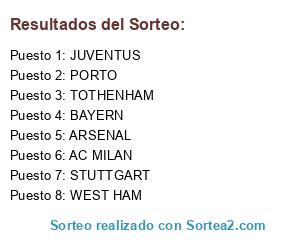 Lista de participantes: STUTTGART, AC MILAN, ARSENAL, JUVENTUS, PORTO, TOTHENHAM, BAYERN, WEST HAM.