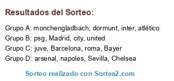 Lista de participantes: Madrid, atlético, Barcelona, Sevilla, juve, roma, napoles, inter, city, united, Chelsea, arsenal, Bayer, dormunt, monchengladbach, psg.