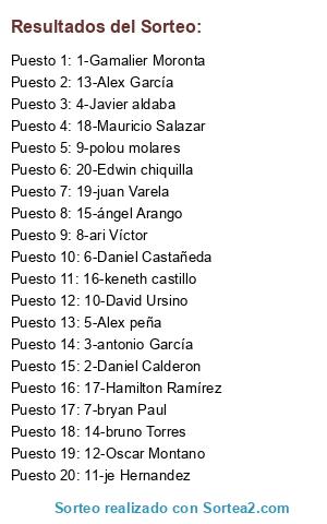 Lista de participantes: 1-Gamalier Moronta, 2-Daniel Calderon, 3-antonio García, 4-Javier aldaba, 5-Alex peña, 6-Daniel Castañeda, 7-bryan Paul, 8-ari Víctor, 9-polou molares, 10-David Ursino, 11-je Hernandez, 12-Oscar Montano, 13-Alex García, 14-bruno Torres, 15-ángel Arango, 16-keneth castillo, 17-Hamilton Ramírez, 18-Mauricio Salazar, 19-juan Varela, 20-Edwin chiquilla.