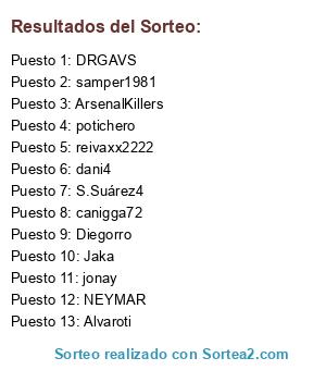 Lista de participantes: NEYMAR, dani4, ArsenalKillers, reivaxx2222, Alvaroti, Diegorro, jonay, samper1981, Jaka, DRGAVS, potichero, S.Suárez4, canigga72.