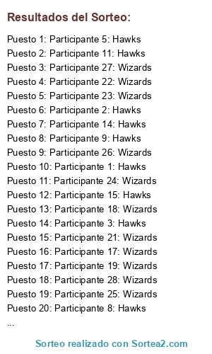 Lista de participantes: Participante 1: Hawks, Participante 2: Hawks, Participante 3: Hawks, Participante 4: Hawks, Participante 5: Hawks, Participante 6: Hawks, Participante 7: Hawks, Participante 8: Hawks, Participante 9: Hawks, Participante 10: Hawks, Participante 11: Hawks, Participante 12: Hawks, Participante 13: Hawks, Participante 14: Hawks, Participante 15: Hawks, Participante 16: Wizards, Participante 17: Wizards, Participante 18: Wizards, Participante 19: Wizards, Participante 20: Wizards, Participante 21: Wizards, Participante 22: Wizards, Participante 23: Wizards, Participante 24: Wizards, Participante 25: Wizards, Participante 26: Wizards, Participante 27: Wizards, Participante 28: Wizards.