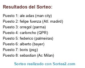 Lista de participantes: ale adas (man city), alberto (bayer), federico (palmeiras), felipe fuenza (Atl. madird), sebastian (Ac Milan), orregol (parma), carloncho (QPR), boris (psg).