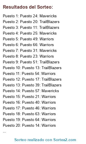 Lista de participantes: Puesto 1: TrailBlazers, Puesto 2: Warriors, Puesto 3: Warriors, Puesto 4: Mavericks, Puesto 5: Warriors, Puesto 6: Warriors, Puesto 7: Mavericks, Puesto 8: Mavericks, Puesto 9: TrailBlazers, Puesto 10: TrailBlazers, Puesto 11: TrailBlazers, Puesto 12: Warriors, Puesto 13: TrailBlazers, Puesto 14: Warriors, Puesto 15: Mavericks, Puesto 16: Mavericks, Puesto 17: TrailBlazers, Puesto 18: Warriors, Puesto 19: Mavericks, Puesto 20: TrailBlazers, Puesto 21: Warriors, Puesto 22: Warriors, Puesto 23: Warriors, Puesto 24: Mavericks, Puesto 25: Mavericks, Puesto 26: Mavericks, Puesto 27: Warriors, Puesto 28: Warriors, Puesto 29: TrailBlazers, Puesto 30: Warriors, Puesto 31: Mavericks, Puesto 32: Mavericks, Puesto 33: TrailBlazers, Puesto 34: Mavericks, Puesto 35: TrailBlazers, Puesto 36: TrailBlazers, Puesto 37: TrailBlazers, Puesto 38: Warriors, Puesto 39: TrailBlazers, Puesto 40: Warriors, Puesto 41: TrailBlazers, Puesto 42: TrailBlazers, Puesto 43: Mavericks, Puesto 44: Warriors, Puesto 45: Mavericks, Puesto 46: Warriors, Puesto 47: Warriors, Puesto 48: TrailBlazers, Puesto 49: Warriors, Puesto 50: Warriors, Puesto 51: TrailBlazers, Puesto 52: TrailBlazers, Puesto 53: TrailBlazers, Puesto 54: Warriors, Puesto 55: Mavericks, Puesto 56: Warriors, Puesto 57: Mavericks, Puesto 58: TrailBlazers, Puesto 59: Warriors, Puesto 60: Warriors, Puesto 61: Mavericks, Puesto 62: Warriors, Puesto 63: Warriors, Puesto 64: Warriors, Puesto 65: TrailBlazers, Puesto 66: Warriors, Puesto 67: TrailBlazers, Puesto 68: TrailBlazers, Puesto 69: Warriors.