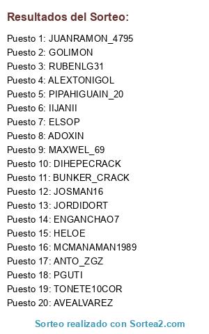 Lista de participantes: BUNKER_CRACK, MAXWEL_69, JOSMAN16, IIJANII, ALEXTONIGOL, PIPAHIGUAIN_20, ENGANCHAO7, TONETE10COR, JUANRAMON_4795, HELOE, RUBENLG31, DIHEPECRACK, MCMANAMAN1989, AVEALVAREZ, ELSOP, GOLIMON, PGUTI, ADOXIN, ANTO_ZGZ, JORDIDORT.