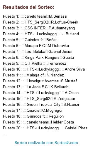 Lista de participantes: : hts melistar S.Mane, : CSS INTER P.Aubameyang, : Futsal Pto.Lumbreras A.Di Maria, : Suas Fc C.Immobile, : Futsal Pto.Lumbreras O.Dembele, : Quadis D.Mertens, : Los Tikitaka Gabriel Jesus, : CSS GARRAFONE M.Depay, : Lycans FC N.Fekir, : C.F.Vielha R.Lukaku, : S.D.Nostromo D.Zapata, : Aguilas Doradas J.Draxler, : Atletico Alfafar K.Navas, : Marapa F.C K.Piatek, : Marapa F.C M.Benatia, : Malaka 88 S.Gnabry, : Green Tropical City T.Ndombele, : Suas Fc T.Partey, : Kings Park Rangers W.Ben Yedder, : Malaga cf J.Vardy, : Drumcode C.F. M.Rashford, : Aguilas Doradas F.Chalov, : C.F.Vielha A.Diallo, : Guindos fc A.Dzyuba, : Futsal Pto.Lumbreras A.Kramaric, : CSS GARRAFONE Oscar dos Santos, : Valencia return alex Grimaldo, : Quadis B.Costil, : Legion.C.F C.Wilson, : hts melistar Diego Carlos, : Lycans FC E.Dier, : Llosoigrut Aventer E.Perez, : Industrias Pesqueras F.Kessie, : Marapa F.C Fred, : Atletico Alfafar Dede, : HTS-☆Luckylaggg☆ Gabriel Pires, : canelo team Gaya, : Atletico Alfafar N.Elvedi, : Marapa F.C Gerard Moreno, : Drumcode C.F. H.Herrera, : C.F.Vielha I.Fernandez, : Llosoigrut Aventer J.Corona, : hts melistar J.Veretout, : Kings Park Rangers L.Alario, : Green Tropical City F.Kostic, : Green Tropical City H.Vanaken, : Green Tropical City Wesley, : Industrias Pesqueras M.Diaz, : HTS_Sergi92 M.Gomez, : Aguilas Doradas M.Nastasic, : Guindos fc M.Sabitzer, : S.D.Nostromo Mikel Oyarzabal, : Hts_Deustown N.N'Koulou, : La Jaca F.C N.Schulz, : CSS INTER Odriozola, : Quadis P.Guerrero, : hts melistar Q.Promes, : Malaka 88 R.Centurion, : Ciudad de La Linea R.Jarstein, : HTS_Sergi92 Rony Lopes, : canelo team S.Kverkvelia, : Llosoigrut Aventer S.Mustafi, : HTS NAVARRORM YT Samu Castillejo, : Aguilas Doradas V.Tsygankov, : Atletico Alfafar V.Wanyama, : Guindos fc Vinicius Junior, : Suas Fc Vitolo, : Drumcode C.F. W.Kannemann, : HTS-☆Luckylaggg☆ Y.Atal, : Llosoigrut Aventer Y.Rakitskiy, : Ciudad de La Linea D.Benedetto, : CSS GARRAFONE K.Balde, : CSS GARRAFONE R.Zobnin, : Quadis Canales, : Guindos fc Manuel Fernandes, : Suas Fc Williams, : HTS NAVARRORM YT Y.M'Vila, : HTS_@HermeticsGC J.Musso, : HTS_@HermeticsGC N.Ake, : HTS_@HermeticsGC Y.Belhanda, : Hts_Deustown Bruno Henrique, : Hts_Deustown L.Sigali, : HTS_Sergi92 B.Yilmaz, : HTS_Sergi92 H.Aouar, : HTS-☆Luckylaggg☆ J.Denayer, : Industrias Pesqueras S.Feghouli, : CSS INTER Rodrigo, : CSS INTER Y.Gervinho, : CSS INTER A.Miranchuk, : Llosoigrut Aventer C.Bakambu, : Kings Park Rangers Lucas Paqueta, : La Jaca F.C Bartra, : La Jaca F.C J.Martinez, : Legion.C.F Danilo Pereira, : Legion.C.F B.Howedes, : Legion.C.F S.Bender, : Lycans FC A.Christensen, : Lycans FC H.Sakai, : HTS NAVARRORM YT Hermoso, : Malaga cf A.Cragno, : Malaga cf M.Acuña, : Malaka 88 J.Correa, : Malaka 88 Felipe, : Marapa F.C Morales, : S.D.Nostromo Dani Ceballos, : S.D.Nostromo M.Odegaard, : HTS NAVARRORM YT M.Dembele, : Valencia return D.Lovren, : Los Tikitaka C.Tatarusanu, : Los Tikitaka Gelson Martins, : Valencia return S.Azmoun, : Aguilas Doradas D.Subasic, : Atletico Alfafar Carlos Soler, : La Jaca F.C Asenjo, : Green Tropical City S.Nzonzi, : Green Tropical City Diego Alves, : Llosoigrut Aventer A.Erokhin, : Aguilas Doradas A.Iwobi, : Ciudad de La Linea S.Nakajima, : Legion.C.F A.Wan-Bissaka, : Ciudad de La Linea A.Yarmolenko, : Malaka 88 Adrien Silva, : HTS-☆Luckylaggg☆ Andre Silva, : Los Tikitaka B.Traore, : Los Tikitaka Dante, : canelo team E.Lamela, : CSS GARRAFONE K.Zouma, : C.F.Vielha Escudero, : La Jaca F.C K.Bellarabi, : CSS GARRAFONE Souza, : HTS_@HermeticsGC G.Cano, : Hts_Deustown G.Defrel, : HTS_@HermeticsGC G.Mercado, : S.D.Nostromo H.Seferovic, : Llosoigrut Aventer Hugo Mallo, : S.D.Nostromo I.Diop, : La Jaca F.C J.Pastore, : Malaka 88 J.Seri, : HTS_Sergi92 Jardel, : Valencia return Joaquin, : HTS-☆Luckylaggg☆ Joelinton, : Valencia return Juanfran Torres, : hts melistar Junior Moraes, : Marapa F.C K.Glik, : Drumcode C.F. E.Bailly, : Guindos fc L.Bender, : Kings Park Rangers L.Milivojevic, : Malaka 88 L.Muriel, : CSS GARRAFONE L.Shaw, : Green Tropical City M.Gradel, : CSS INTER M.Musacchio, : Atletico Alfafar M.Samatta, : Lycans FC M.Vecino, : HTS-☆Luckylaggg☆ M.Weiser, : C.F.Vielha N.Bentaleb, : canelo team N.Maksimovic, : Kings Park Rangers N.Sliti, : Ciudad de La Linea Pedro Geromel, : Drumcode C.F. R.Fahrmann, : Futsal Pto.Lumbreras D.Vida, : Futsal Pto.Lumbreras Fabregas, : Los Tikitaka T.Savanier, : Suas Fc W.Cyprien, : canelo team Y.Gazinskiy, : Malaka 88 Y.Mina, : Ciudad de La Linea Yuri, : Drumcode C.F. D.Berardi, : Valencia return Lj.Fejsa, : Guindos fc A.Mandi, : hts melistar K.Trapp, : Lycans FC L.Ocampos, : Valencia return Navas, : HTS NAVARRORM YT Jemerson, : HTS NAVARRORM YT I.Akinfeev, : HTS_@HermeticsGC M.Marega, : Hts_Deustown E.Salvio, : Hts_Deustown Fagner, : HTS_Sergi92 M.Lanzini, : Futsal Pto.Lumbreras Junior Firpo, : Industrias Pesqueras Fabio Cruzeiro, : Industrias Pesqueras J.Bamba, : Industrias Pesqueras Renato Augusto, : CSS INTER Alex Teixeira, : CSS INTER iñigo Martinez, : Futsal Pto.Lumbreras K.Gameiro, : Kings Park Rangers A.Ljajic, : La Jaca F.C Xavi, : Legion.C.F E.Andrada, : Suas Fc Y.Tielemans, : Lycans FC C.Aranguiz, : Malaga cf Gabriel Paulista, : Malaga cf N.Nandez, : Malaga cf B.Dost, : Valencia return C.Pulisic, : Marapa F.C G.Medel, : HTS-☆Luckylaggg☆ J.Andersen, : Quadis J.King, : Quadis L.Tousart, : Quadis C.Tevez, : Atletico Alfafar V.Aboubakar, : S.D.Nostromo O.Zinchenko, : Aguilas Doradas R.Barkley, : Los Tikitaka D.Origi, : Aguilas Doradas B.Reynet, : Aguilas Doradas G.Krychowiak, : Aguilas Doradas Pablo, : Atletico Alfafar H.Onyekuru, : Green Tropical City K.Mbabu, : Green Tropical City Musa, : Ciudad de La Linea J.Veltman, : Ciudad de La Linea S.Kagawa, : HTS_Sergi92 Nemanja Maksimovic, : CSS GARRAFONE B.Embolo, : CSS GARRAFONE Y.Gomez, : CSS GARRAFONE C.Smalling, : Drumcode C.F. Badou N'Diaye, : Futsal Pto.Lumbreras F.Gago, : Futsal Pto.Lumbreras Portu, : Futsa