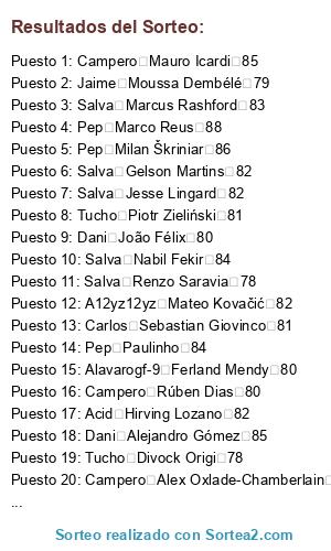 Lista de participantes: Jaime Ibrahima Konaté 79, Jaime Moussa Dembélé 79, Jaime Benjamin Pavard 79, Jaime Lorenzo Pellegrini 79, Jaime Jonathan Ikoné 78, Jaime Cengiz Ünder 78, Jaime Renan Lodi 77, Jaime Jonathan Bamba 78, Jaime Danilo 79, Jaime Tammy Abraham 76, Jaime Pierluigi Gollini 76, Jaime Benjamin Stambouli 79, Jaime Steven Bergwijn 82, Jaime Tanguy Ndombele 81, Jaime Wilfred Ndidi 81, Jaime Nathan Aké 81, Jaime Nico Schulz 82, Jaime Timo Horn 82, Jaime Julian Brandt 84, Dani Jordan Lukaku 77, Dani Aaron Wan-Bissaka 79, Dani Loris KariusL 79, Dani Martin ØdegaardL 78, Dani Joshua King 79, Dani Luciano Acosta 76, Dani David Abraham 78, Dani Shoya Nakajima 79, Dani Christian Luyindama 77, Dani Stanislav Lobotka 79, Dani Ross Barkley 79, Dani Yerry Mina 78, Dani João Félix 80, Dani Lautaro Martínez 81, Dani Victor Lindelöf 81, Dani Alessio Cragno 81, Dani Houssem Aouar 81, Dani Kerem Demirbay 82, Dani Kyle Walker 84, Javierux Allan Saint-Maximin 79, Javierux Kangin Lee 76, Javierux Ruslan Malinovskyi 79, Javierux Federico Chiesa 79, Javierux Mariano Delantero 79, Javierux Marcano 79, Javierux Nick Pope 79, Javierux Angeliño 79, Javierux Antonio Candreva 79, Javierux Mariano Lateral 79, Javierux Eljero Elia 77, Javierux Leonardo Pavoletti 78, Javierux Quincy Promes 82, Javierux Geoffrey Kondogbia 81, Javierux Mario Hermoso 80, Javierux David Soria 82, Javierux Aleksandar Kolarov 82, Javierux Juiano Mestres 82, Javierux Memphis Depay 84, Romeritto Vinícius Jr. 79, Romeritto Achraf HakimiL 79, Romeritto Dani Olmo 79, Romeritto Diego Carlos 79, Romeritto Juan Musso 78, Romeritto Leandro Trossard 79, Romeritto Okay Yokuşlu 78, Romeritto Issa Diop 78, Romeritto John Brooks 79, Romeritto Bertrand Traoré 78, Romeritto Justin Kluivert 76, Romeritto Aleñá 76, Romeritto Taison 82, Romeritto Cédric Bakambu 82, Romeritto Thomas Partey 82, Romeritto Karim Bellarabi 82, Romeritto Nélson Semedo 82, Romeritto Raphaelito Anjos 82, Romeritto Jadon Sancho 84, Carlos Christian Pulisic 79, Carlos Jeison MurilloL 79, Carlos Abdou Diallo 79, Carlos Rodrigo Bentancur 79, Carlos Denis Zakaria 78, Carlos Kevin Mbabu 77, Carlos Mbwana Ally Samatta 79, Carlos Lucas Paquetá 79, Carlos Andrey Lunev 79, Carlos Rodrigo Javier De Paul 78, Carlos Malang Sarr 76, Carlos De Tomás 79, Carlos Presnel Kimpembe 82, Carlos Ander Herrera 82, Carlos Gayà 80, Carlos Dani CeballosL 81, Carlos Andrea Belotti 82, Carlos Thomas Strakosha 82, Carlos Ousmane Dembélé 84, Acid Jean-Philippe Gbamin 79, Acid Junior Firpo 79, Acid Daniel Podence 78, Acid DeAndre Yedlin 76, Acid Henry Onyekuru 78, Acid Herrerín 79, Acid Fred 79, Acid Santiago Arias 79, Acid Nahitan Nández 77, Acid Jason Denayer 79, Acid Ezequiel Lavezzi 79, Acid Wylan Cyprien 77, Acid Hirving Lozano 82, Acid Éder Militão 81, Acid Moussa Sissoko 81, Acid David Neres 81, Acid Eric Bailly 80, Acid Tomáš Vaclík 81, Acid Timo Werner 83, Caveman Tomáš Souček 79, Caveman Thilo Kehrer 79, Caveman Ben Chilwell 79, Caveman Ismaïla Sarr 78, Caveman Alex Meret 78, Caveman Nadiem Amiri 78, Caveman Serge Aurier 79, Caveman André Silva 79, Caveman Michael Ngadeu-Ngadjui 78, Caveman Jefferson Lerma 79, Caveman Matías Zaracho 78, Caveman Munir 79, Caveman Donny van de Beek 81, Caveman Kevin Volland 82, Caveman Gabriel Jesus 82, Caveman Alphonse Areola 82, Caveman Joel Matip 82, Caveman Sergi Roberto 82, Caveman Kingsley Coman 84, Salva Franck Yannick Kessié 79, Salva Dan-Axel Zagadou 79, Salva Richarlison 79, Salva Raphinha 79, Salva Renzo Saravia 78, Salva Dominik Livaković 79, Salva Eric Dier 79, Salva Yuri Berchiche 79, Salva Roman Zobnin 79, Salva M'Baye Niang 77, Salva Ridgeciano Haps 76, Salva Matías Vargas 77, Salva Gelson Martins 82, Salva Antonio Rüdiger 82, Salva Yussuf Poulsen 81, Salva Mattia Perin 82, Salva Jérôme Roussillon 82, Salva Hakan Çalhanoğlu 80, Salva Marcus Rashford 83, A12yz12yz Michail Antonio 78, A12yz12yz Wu Lei 79, A12yz12yz Dayot Upamecano 77, A12yz12yz Adama Traoré 76, A12yz12yz Marcos Rojo 78, A12yz12yz Sander Berge 79, A12yz12yz Esteban Andrada 79, A12yz12yz Capa 78, A12yz12yz Kieran Tierney 76, A12yz12yz Darwin Machís 76, A12yz12yz Andriy Lunin 76, A12yz12yz Vitolo 79, A12yz12yz Segundo Mandíquez 81, A12yz12yz Kurt Zouma 80, A12yz12yz Mateo Kovačić 82, A12yz12yz Daniele De Rossi 82, A12yz12yz Jesús Navas 82, A12yz12yz Deulofeu 80, A12yz12yz Douglas Costa 84, Alavarogf-9 Badou Ndiaye 76, Alavarogf-9 Frank Acheampong 77, Alavarogf-9 Alex Teixeira 79, Alavarogf-9 Ike Opara 76, Alavarogf-9 Joakim Mæhle 77, Alavarogf-9 Guaita 79, Alavarogf-9 Frank Fabra 77, Alavarogf-9 Emmanuel Boateng 77, Alavarogf-9 Mubarak Wakaso 76, Alavarogf-9 Georgiy Dzhikiya 78, Alavarogf-9 Ibrahim Amadou 78, Alavarogf-9 Andriy Pyatov 77, Alavarogf-9 Leon Bailey 82, Alavarogf-9 Alessandro Florenzi 81, Alavarogf-9 Thomas Meunier 82, Alavarogf-9 Moussa Marega 80, Alavarogf-9 Ferland Mendy 80, Alavarogf-9 Ante Rebić 80, Alavarogf-9 Kai Havertz 84, Campero Lukas Klostermann 79, Campero Alban LafontL 79, Campero Willy Boly 79, Campero Milot Rashica 79, Campero Callum Hudson-Odoi 76, Campero Theo Hernández 76, Campero Bruma 78, Campero Victor Wanyama 78, Campero Soares 79, Campero Simon Deli 78, Campero Maxwel Cornet 76, Campero Merino 79, Campero Iñaki Williams 82, Campero Naby Keïta 82, Campero Rúben Dias 80, Campero André Onana 82, Campero Thiago Mendes 81, Campero Emre Can 81, Campero Nicolas Pépé 83, Pep Mário Rui 79, Pep Lucas Alario 79, Pep Cristian Pavón 78, Pep Danny da Costa 79, Pep Benjamin Verbič 79, Pep Niklas Stark 79, Pep Enzo Martín Riquero 79, Pep Adnan Januzaj 79, Pep Jaume 76, Pep Denis Cheryshev 79, Pep Rúben Vezo 77, Pep Rodrygo 76, Pep Jamie Vardy 82, Pep Willian 82, Pep Thomas Delaney 82, Pep Gabriel Paulista 82, Pep Sergio Asenjo 82, Pep Jaime Nicolás Frendado 81, Pep Paulinho 84, Tucho Antonio Mirante 79, Tucho Damián Suárez 79, Tucho Divock Origi 78, Tucho Ogenyi Onazi 76, Tucho Arthur Masuaku 76, T