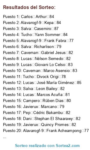 Lista de participantes: Jaime Ibrahima Konaté 79, Jaime Moussa Dembélé 79, Jaime Benjamin Pavard 79, Jaime Lorenzo Pellegrini 79, Jaime Jonathan Ikoné 78, Jaime Cengiz Ünder 78, Jaime Renan Lodi 77, Jaime Jonathan Bamba 78, Jaime Danilo 79, Jaime Tammy Abraham 76, Jaime Pierluigi Gollini 76, Jaime Benjamin Stambouli 79, Jaime Steven Bergwijn 82, Jaime Tanguy Ndombele 81, Jaime Wilfred Ndidi 81, Jaime Nathan Aké 81, Jaime Nico Schulz 82, Jaime Timo Horn 82, Jaime Julian Brandt 84, Dani Jordan Lukaku 77, Dani Aaron Wan-Bissaka 79, Dani Loris KariusL 79, Dani Martin ØdegaardL 78, Dani Joshua King 79, Dani Luciano Acosta 76, Dani David Abraham 78, Dani Shoya Nakajima 79, Dani Christian Luyindama 77, Dani Stanislav Lobotka 79, Dani Ross Barkley 79, Dani Yerry Mina 78, Dani João Félix 80, Dani Lautaro Martínez 81, Dani Victor Lindelöf 81, Dani Alessio Cragno 81, Dani Houssem Aouar 81, Dani Kerem Demirbay 82, Dani Kyle Walker 84, Javierux Allan Saint-Maximin 79, Javierux Kangin Lee 76, Javierux Ruslan Malinovskyi 79, Javierux Federico Chiesa 79, Javierux Mariano Delantero 79, Javierux Marcano 79, Javierux Nick Pope 79, Javierux Angeliño 79, Javierux Antonio Candreva 79, Javierux Mariano Lateral 79, Javierux Eljero Elia 77, Javierux Leonardo Pavoletti 78, Javierux Quincy Promes 82, Javierux Geoffrey Kondogbia 81, Javierux Mario Hermoso 80, Javierux David Soria 82, Javierux Aleksandar Kolarov 82, Javierux Juiano Mestres 82, Javierux Memphis Depay 84, Romeritto Vinícius Jr. 79, Romeritto Achraf HakimiL 79, Romeritto Dani Olmo 79, Romeritto Diego Carlos 79, Romeritto Juan Musso 78, Romeritto Leandro Trossard 79, Romeritto Okay Yokuşlu 78, Romeritto Issa Diop 78, Romeritto John Brooks 79, Romeritto Bertrand Traoré 78, Romeritto Justin Kluivert 76, Romeritto Aleñá 76, Romeritto Taison 82, Romeritto Cédric Bakambu 82, Romeritto Thomas Partey 82, Romeritto Karim Bellarabi 82, Romeritto Nélson Semedo 82, Romeritto Raphaelito Anjos 82, Romeritto Jadon Sancho 84, Carlos Christian Pulisic 79, Carlos Jeison MurilloL 79, Carlos Abdou Diallo 79, Carlos Rodrigo Bentancur 79, Carlos Denis Zakaria 78, Carlos Kevin Mbabu 77, Carlos Mbwana Ally Samatta 79, Carlos Lucas Paquetá 79, Carlos Andrey Lunev 79, Carlos Rodrigo Javier De Paul 78, Carlos Malang Sarr 76, Carlos De Tomás 79, Carlos Presnel Kimpembe 82, Carlos Ander Herrera 82, Carlos Gayà 80, Carlos Dani CeballosL 81, Carlos Andrea Belotti 82, Carlos Thomas Strakosha 82, Carlos Ousmane Dembélé 84, Acid Jean-Philippe Gbamin 79, Acid Junior Firpo 79, Acid Daniel Podence 78, Acid DeAndre Yedlin 76, Acid Henry Onyekuru 78, Acid Herrerín 79, Acid Fred 79, Acid Santiago Arias 79, Acid Nahitan Nández 77, Acid Jason Denayer 79, Acid Ezequiel Lavezzi 79, Acid Wylan Cyprien 77, Acid Hirving Lozano 82, Acid Éder Militão 81, Acid Moussa Sissoko 81, Acid David Neres 81, Acid Eric Bailly 80, Acid Tomáš Vaclík 81, Acid Timo Werner 83, Caveman Tomáš Souček 79, Caveman Thilo Kehrer 79, Caveman Ben Chilwell 79, Caveman Ismaïla Sarr 78, Caveman Alex Meret 78, Caveman Nadiem Amiri 78, Caveman Serge Aurier 79, Caveman André Silva 79, Caveman Michael Ngadeu-Ngadjui 78, Caveman Jefferson Lerma 79, Caveman Matías Zaracho 78, Caveman Munir 79, Caveman Donny van de Beek 81, Caveman Kevin Volland 82, Caveman Gabriel Jesus 82, Caveman Alphonse Areola 82, Caveman Joel Matip 82, Caveman Sergi Roberto 82, Caveman Kingsley Coman 84, Salva Franck Yannick Kessié 79, Salva Dan-Axel Zagadou 79, Salva Richarlison 79, Salva Raphinha 79, Salva Renzo Saravia 78, Salva Dominik Livaković 79, Salva Eric Dier 79, Salva Yuri Berchiche 79, Salva Roman Zobnin 79, Salva M'Baye Niang 77, Salva Ridgeciano Haps 76, Salva Matías Vargas 77, Salva Gelson Martins 82, Salva Antonio Rüdiger 82, Salva Yussuf Poulsen 81, Salva Mattia Perin 82, Salva Jérôme Roussillon 82, Salva Hakan Çalhanoğlu 80, Salva Marcus Rashford 83, A12yz12yz Michail Antonio 78, A12yz12yz Wu Lei 79, A12yz12yz Dayot Upamecano 77, A12yz12yz Adama Traoré 76, A12yz12yz Marcos Rojo 78, A12yz12yz Sander Berge 79, A12yz12yz Esteban Andrada 79, A12yz12yz Capa 78, A12yz12yz Kieran Tierney 76, A12yz12yz Darwin Machís 76, A12yz12yz Andriy Lunin 76, A12yz12yz Vitolo 79, A12yz12yz Segundo Mandíquez 81, A12yz12yz Kurt Zouma 80, A12yz12yz Mateo Kovačić 82, A12yz12yz Daniele De Rossi 82, A12yz12yz Jesús Navas 82, A12yz12yz Deulofeu 80, A12yz12yz Douglas Costa 84, Alavarogf-9 Badou Ndiaye 76, Alavarogf-9 Frank Acheampong 77, Alavarogf-9 Alex Teixeira 79, Alavarogf-9 Ike Opara 76, Alavarogf-9 Joakim Mæhle 77, Alavarogf-9 Guaita 79, Alavarogf-9 Frank Fabra 77, Alavarogf-9 Emmanuel Boateng 77, Alavarogf-9 Mubarak Wakaso 76, Alavarogf-9 Georgiy Dzhikiya 78, Alavarogf-9 Ibrahim Amadou 78, Alavarogf-9 Andriy Pyatov 77, Alavarogf-9 Leon Bailey 82, Alavarogf-9 Alessandro Florenzi 81, Alavarogf-9 Thomas Meunier 82, Alavarogf-9 Moussa Marega 80, Alavarogf-9 Ferland Mendy 80, Alavarogf-9 Ante Rebić 80, Alavarogf-9 Kai Havertz 84, Campero Lukas Klostermann 79, Campero Alban LafontL 79, Campero Willy Boly 79, Campero Milot Rashica 79, Campero Callum Hudson-Odoi 76, Campero Theo Hernández 76, Campero Bruma 78, Campero Victor Wanyama 78, Campero Soares 79, Campero Simon Deli 78, Campero Maxwel Cornet 76, Campero Merino 79, Campero Iñaki Williams 82, Campero Naby Keïta 82, Campero Rúben Dias 80, Campero André Onana 82, Campero Thiago Mendes 81, Campero Emre Can 81, Campero Nicolas Pépé 83, Pep Mário Rui 79, Pep Lucas Alario 79, Pep Cristian Pavón 78, Pep Danny da Costa 79, Pep Benjamin Verbič 79, Pep Niklas Stark 79, Pep Enzo Martín Riquero 79, Pep Adnan Januzaj 79, Pep Jaume 76, Pep Denis Cheryshev 79, Pep Rúben Vezo 77, Pep Rodrygo 76, Pep Jamie Vardy 82, Pep Willian 82, Pep Thomas Delaney 82, Pep Gabriel Paulista 82, Pep Sergio Asenjo 82, Pep Jaime Nicolás Frendado 81, Pep Paulinho 84, Tucho Antonio Mirante 79, Tucho Damián Suárez 79, Tucho Divock Origi 78, Tucho Ogenyi Onazi 76, Tucho Arthur Masuaku 76, T