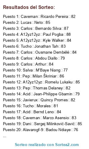 Lista de participantes: Jaime Ibrahima Konaté 79, Jaime Moussa Dembélé 79, Jaime Benjamin Pavard 79, Jaime Lorenzo Pellegrini 79, Jaime Jonathan Ikoné 78, Jaime Cengiz Ünder 78, Jaime Renan Lodi 77, Jaime Jonathan Bamba 78, Jaime Danilo 79, Jaime Tammy Abraham 76, Jaime Pierluigi Gollini 76, Jaime Benjamin Stambouli 79, Jaime Steven Bergwijn 82, Jaime Tanguy Ndombele 81, Jaime Wilfred Ndidi 81, Jaime Nathan Aké 81, Jaime Nico Schulz 82, Jaime Timo Horn 82, Jaime Julian Brandt 84, Dani Jordan Lukaku 77, Dani Aaron Wan-Bissaka 79, Dani Loris KariusL 79, Dani Martin ØdegaardL 78, Dani Joshua King 79, Dani Luciano Acosta 76, Dani David Abraham 78, Dani Shoya Nakajima 79, Dani Christian Luyindama 77, Dani Stanislav Lobotka 79, Dani Ross Barkley 79, Dani Yerry Mina 78, Dani João Félix 80, Dani Lautaro Martínez 81, Dani Victor Lindelöf 81, Dani Alessio Cragno 81, Dani Houssem Aouar 81, Dani Kerem Demirbay 82, Dani Kyle Walker 84, Javierux Allan Saint-Maximin 79, Javierux Kangin Lee 76, Javierux Ruslan Malinovskyi 79, Javierux Federico Chiesa 79, Javierux Mariano Delantero 79, Javierux Marcano 79, Javierux Nick Pope 79, Javierux Angeliño 79, Javierux Antonio Candreva 79, Javierux Mariano Lateral 79, Javierux Eljero Elia 77, Javierux Leonardo Pavoletti 78, Javierux Quincy Promes 82, Javierux Geoffrey Kondogbia 81, Javierux Mario Hermoso 80, Javierux David Soria 82, Javierux Aleksandar Kolarov 82, Javierux Juiano Mestres 82, Javierux Memphis Depay 84, Romeritto Vinícius Jr. 79, Romeritto Achraf HakimiL 79, Romeritto Dani Olmo 79, Romeritto Diego Carlos 79, Romeritto Juan Musso 78, Romeritto Leandro Trossard 79, Romeritto Okay Yokuşlu 78, Romeritto Issa Diop 78, Romeritto John Brooks 79, Romeritto Bertrand Traoré 78, Romeritto Justin Kluivert 76, Romeritto Aleñá 76, Romeritto Taison 82, Romeritto Cédric Bakambu 82, Romeritto Thomas Partey 82, Romeritto Karim Bellarabi 82, Romeritto Nélson Semedo 82, Romeritto Raphaelito Anjos 82, Romeritto Jadon Sancho 84, Carlos Christian Pulisic 79, Carlos Jeison MurilloL 79, Carlos Abdou Diallo 79, Carlos Rodrigo Bentancur 79, Carlos Denis Zakaria 78, Carlos Kevin Mbabu 77, Carlos Mbwana Ally Samatta 79, Carlos Lucas Paquetá 79, Carlos Andrey Lunev 79, Carlos Rodrigo Javier De Paul 78, Carlos Malang Sarr 76, Carlos De Tomás 79, Carlos Presnel Kimpembe 82, Carlos Ander Herrera 82, Carlos Gayà 80, Carlos Dani CeballosL 81, Carlos Andrea Belotti 82, Carlos Thomas Strakosha 82, Carlos Ousmane Dembélé 84, Acid Jean-Philippe Gbamin 79, Acid Junior Firpo 79, Acid Daniel Podence 78, Acid DeAndre Yedlin 76, Acid Henry Onyekuru 78, Acid Herrerín 79, Acid Fred 79, Acid Santiago Arias 79, Acid Nahitan Nández 77, Acid Jason Denayer 79, Acid Ezequiel Lavezzi 79, Acid Wylan Cyprien 77, Acid Hirving Lozano 82, Acid Éder Militão 81, Acid Moussa Sissoko 81, Acid David Neres 81, Acid Eric Bailly 80, Acid Tomáš Vaclík 81, Acid Timo Werner 83, Caveman Tomáš Souček 79, Caveman Thilo Kehrer 79, Caveman Ben Chilwell 79, Caveman Ismaïla Sarr 78, Caveman Alex Meret 78, Caveman Nadiem Amiri 78, Caveman Serge Aurier 79, Caveman André Silva 79, Caveman Michael Ngadeu-Ngadjui 78, Caveman Jefferson Lerma 79, Caveman Matías Zaracho 78, Caveman Munir 79, Caveman Donny van de Beek 81, Caveman Kevin Volland 82, Caveman Gabriel Jesus 82, Caveman Alphonse Areola 82, Caveman Joel Matip 82, Caveman Sergi Roberto 82, Caveman Kingsley Coman 84, Salva Franck Yannick Kessié 79, Salva Dan-Axel Zagadou 79, Salva Richarlison 79, Salva Raphinha 79, Salva Renzo Saravia 78, Salva Dominik Livaković 79, Salva Eric Dier 79, Salva Yuri Berchiche 79, Salva Roman Zobnin 79, Salva M'Baye Niang 77, Salva Ridgeciano Haps 76, Salva Matías Vargas 77, Salva Gelson Martins 82, Salva Antonio Rüdiger 82, Salva Yussuf Poulsen 81, Salva Mattia Perin 82, Salva Jérôme Roussillon 82, Salva Hakan Çalhanoğlu 80, Salva Marcus Rashford 83, A12yz12yz Michail Antonio 78, A12yz12yz Wu Lei 79, A12yz12yz Dayot Upamecano 77, A12yz12yz Adama Traoré 76, A12yz12yz Marcos Rojo 78, A12yz12yz Sander Berge 79, A12yz12yz Esteban Andrada 79, A12yz12yz Capa 78, A12yz12yz Kieran Tierney 76, A12yz12yz Darwin Machís 76, A12yz12yz Andriy Lunin 76, A12yz12yz Vitolo 79, A12yz12yz Segundo Mandíquez 81, A12yz12yz Kurt Zouma 80, A12yz12yz Mateo Kovačić 82, A12yz12yz Daniele De Rossi 82, A12yz12yz Jesús Navas 82, A12yz12yz Deulofeu 80, A12yz12yz Douglas Costa 84, Alavarogf-9 Badou Ndiaye 76, Alavarogf-9 Frank Acheampong 77, Alavarogf-9 Alex Teixeira 79, Alavarogf-9 Ike Opara 76, Alavarogf-9 Joakim Mæhle 77, Alavarogf-9 Guaita 79, Alavarogf-9 Frank Fabra 77, Alavarogf-9 Emmanuel Boateng 77, Alavarogf-9 Mubarak Wakaso 76, Alavarogf-9 Georgiy Dzhikiya 78, Alavarogf-9 Ibrahim Amadou 78, Alavarogf-9 Andriy Pyatov 77, Alavarogf-9 Leon Bailey 82, Alavarogf-9 Alessandro Florenzi 81, Alavarogf-9 Thomas Meunier 82, Alavarogf-9 Moussa Marega 80, Alavarogf-9 Ferland Mendy 80, Alavarogf-9 Ante Rebić 80, Alavarogf-9 Kai Havertz 84, Campero Lukas Klostermann 79, Campero Alban LafontL 79, Campero Willy Boly 79, Campero Milot Rashica 79, Campero Callum Hudson-Odoi 76, Campero Theo Hernández 76, Campero Bruma 78, Campero Victor Wanyama 78, Campero Soares 79, Campero Simon Deli 78, Campero Maxwel Cornet 76, Campero Merino 79, Campero Iñaki Williams 82, Campero Naby Keïta 82, Campero Rúben Dias 80, Campero André Onana 82, Campero Thiago Mendes 81, Campero Emre Can 81, Campero Nicolas Pépé 83, Pep Mário Rui 79, Pep Lucas Alario 79, Pep Cristian Pavón 78, Pep Danny da Costa 79, Pep Benjamin Verbič 79, Pep Niklas Stark 79, Pep Enzo Martín Riquero 79, Pep Adnan Januzaj 79, Pep Jaume 76, Pep Denis Cheryshev 79, Pep Rúben Vezo 77, Pep Rodrygo 76, Pep Jamie Vardy 82, Pep Willian 82, Pep Thomas Delaney 82, Pep Gabriel Paulista 82, Pep Sergio Asenjo 82, Pep Jaime Nicolás Frendado 81, Pep Paulinho 84, Tucho Antonio Mirante 79, Tucho Damián Suárez 79, Tucho Divock Origi 78, Tucho Ogenyi Onazi 76, Tucho Arthur Masuaku 76, T