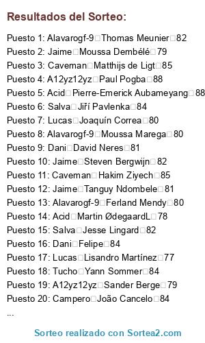 Lista de participantes: Jaime Ibrahima Konaté 79, Jaime Moussa Dembélé 79, Jaime Benjamin Pavard 79, Jaime Lorenzo Pellegrini 79, Jaime Jonathan Ikoné 78, Jaime Cengiz Ünder 78, Jaime Renan Lodi 77, Jaime Jonathan Bamba 78, Jaime Danilo 79, Jaime Tammy Abraham 76, Jaime Pierluigi Gollini 76, Jaime Benjamin Stambouli 79, Jaime Steven Bergwijn 82, Jaime Tanguy Ndombele 81, Jaime Wilfred Ndidi 81, Jaime Nathan Aké 81, Jaime Nico Schulz 82, Jaime Timo Horn 82, Jaime Julian Brandt 84, Dani Jordan Lukaku 77, Dani Aaron Wan-Bissaka 79, Dani Loris KariusL 79, Dani Martin ØdegaardL 78, Dani Joshua King 79, Dani Luciano Acosta 76, Dani David Abraham 78, Dani Shoya Nakajima 79, Dani Christian Luyindama 77, Dani Stanislav Lobotka 79, Dani Ross Barkley 79, Dani Yerry Mina 78, Dani João Félix 80, Dani Lautaro Martínez 81, Dani Victor Lindelöf 81, Dani Alessio Cragno 81, Dani Houssem Aouar 81, Dani Kerem Demirbay 82, Dani Kyle Walker 84, Javierux Allan Saint-Maximin 79, Javierux Kangin Lee 76, Javierux Ruslan Malinovskyi 79, Javierux Federico Chiesa 79, Javierux Mariano Delantero 79, Javierux Marcano 79, Javierux Nick Pope 79, Javierux Angeliño 79, Javierux Antonio Candreva 79, Javierux Mariano Lateral 79, Javierux Eljero Elia 77, Javierux Leonardo Pavoletti 78, Javierux Quincy Promes 82, Javierux Geoffrey Kondogbia 81, Javierux Mario Hermoso 80, Javierux David Soria 82, Javierux Aleksandar Kolarov 82, Javierux Juiano Mestres 82, Javierux Memphis Depay 84, Romeritto Vinícius Jr. 79, Romeritto Achraf HakimiL 79, Romeritto Dani Olmo 79, Romeritto Diego Carlos 79, Romeritto Juan Musso 78, Romeritto Leandro Trossard 79, Romeritto Okay Yokuşlu 78, Romeritto Issa Diop 78, Romeritto John Brooks 79, Romeritto Bertrand Traoré 78, Romeritto Justin Kluivert 76, Romeritto Aleñá 76, Romeritto Taison 82, Romeritto Cédric Bakambu 82, Romeritto Thomas Partey 82, Romeritto Karim Bellarabi 82, Romeritto Nélson Semedo 82, Romeritto Raphaelito Anjos 82, Romeritto Jadon Sancho 84, Carlos Christian Pulisic 79, Carlos Jeison MurilloL 79, Carlos Abdou Diallo 79, Carlos Rodrigo Bentancur 79, Carlos Denis Zakaria 78, Carlos Kevin Mbabu 77, Carlos Mbwana Ally Samatta 79, Carlos Lucas Paquetá 79, Carlos Andrey Lunev 79, Carlos Rodrigo Javier De Paul 78, Carlos Malang Sarr 76, Carlos De Tomás 79, Carlos Presnel Kimpembe 82, Carlos Ander Herrera 82, Carlos Gayà 80, Carlos Dani CeballosL 81, Carlos Andrea Belotti 82, Carlos Thomas Strakosha 82, Carlos Ousmane Dembélé 84, Acid Jean-Philippe Gbamin 79, Acid Junior Firpo 79, Acid Daniel Podence 78, Acid DeAndre Yedlin 76, Acid Henry Onyekuru 78, Acid Herrerín 79, Acid Fred 79, Acid Santiago Arias 79, Acid Nahitan Nández 77, Acid Jason Denayer 79, Acid Ezequiel Lavezzi 79, Acid Wylan Cyprien 77, Acid Hirving Lozano 82, Acid Éder Militão 81, Acid Moussa Sissoko 81, Acid David Neres 81, Acid Eric Bailly 80, Acid Tomáš Vaclík 81, Acid Timo Werner 83, Caveman Tomáš Souček 79, Caveman Thilo Kehrer 79, Caveman Ben Chilwell 79, Caveman Ismaïla Sarr 78, Caveman Alex Meret 78, Caveman Nadiem Amiri 78, Caveman Serge Aurier 79, Caveman André Silva 79, Caveman Michael Ngadeu-Ngadjui 78, Caveman Jefferson Lerma 79, Caveman Matías Zaracho 78, Caveman Munir 79, Caveman Donny van de Beek 81, Caveman Kevin Volland 82, Caveman Gabriel Jesus 82, Caveman Alphonse Areola 82, Caveman Joel Matip 82, Caveman Sergi Roberto 82, Caveman Kingsley Coman 84, Salva Franck Yannick Kessié 79, Salva Dan-Axel Zagadou 79, Salva Richarlison 79, Salva Raphinha 79, Salva Renzo Saravia 78, Salva Dominik Livaković 79, Salva Eric Dier 79, Salva Yuri Berchiche 79, Salva Roman Zobnin 79, Salva M'Baye Niang 77, Salva Ridgeciano Haps 76, Salva Matías Vargas 77, Salva Gelson Martins 82, Salva Antonio Rüdiger 82, Salva Yussuf Poulsen 81, Salva Mattia Perin 82, Salva Jérôme Roussillon 82, Salva Hakan Çalhanoğlu 80, Salva Marcus Rashford 83, A12yz12yz Michail Antonio 78, A12yz12yz Wu Lei 79, A12yz12yz Dayot Upamecano 77, A12yz12yz Adama Traoré 76, A12yz12yz Marcos Rojo 78, A12yz12yz Sander Berge 79, A12yz12yz Esteban Andrada 79, A12yz12yz Capa 78, A12yz12yz Kieran Tierney 76, A12yz12yz Darwin Machís 76, A12yz12yz Andriy Lunin 76, A12yz12yz Vitolo 79, A12yz12yz Segundo Mandíquez 81, A12yz12yz Kurt Zouma 80, A12yz12yz Mateo Kovačić 82, A12yz12yz Daniele De Rossi 82, A12yz12yz Jesús Navas 82, A12yz12yz Deulofeu 80, A12yz12yz Douglas Costa 84, Alavarogf-9 Badou Ndiaye 76, Alavarogf-9 Frank Acheampong 77, Alavarogf-9 Alex Teixeira 79, Alavarogf-9 Ike Opara 76, Alavarogf-9 Joakim Mæhle 77, Alavarogf-9 Guaita 79, Alavarogf-9 Frank Fabra 77, Alavarogf-9 Emmanuel Boateng 77, Alavarogf-9 Mubarak Wakaso 76, Alavarogf-9 Georgiy Dzhikiya 78, Alavarogf-9 Ibrahim Amadou 78, Alavarogf-9 Andriy Pyatov 77, Alavarogf-9 Leon Bailey 82, Alavarogf-9 Alessandro Florenzi 81, Alavarogf-9 Thomas Meunier 82, Alavarogf-9 Moussa Marega 80, Alavarogf-9 Ferland Mendy 80, Alavarogf-9 Ante Rebić 80, Alavarogf-9 Kai Havertz 84, Campero Lukas Klostermann 79, Campero Alban LafontL 79, Campero Willy Boly 79, Campero Milot Rashica 79, Campero Callum Hudson-Odoi 76, Campero Theo Hernández 76, Campero Bruma 78, Campero Victor Wanyama 78, Campero Soares 79, Campero Simon Deli 78, Campero Maxwel Cornet 76, Campero Merino 79, Campero Iñaki Williams 82, Campero Naby Keïta 82, Campero Rúben Dias 80, Campero André Onana 82, Campero Thiago Mendes 81, Campero Emre Can 81, Campero Nicolas Pépé 83, Pep Mário Rui 79, Pep Lucas Alario 79, Pep Cristian Pavón 78, Pep Danny da Costa 79, Pep Benjamin Verbič 79, Pep Niklas Stark 79, Pep Enzo Martín Riquero 79, Pep Adnan Januzaj 79, Pep Jaume 76, Pep Denis Cheryshev 79, Pep Rúben Vezo 77, Pep Rodrygo 76, Pep Jamie Vardy 82, Pep Willian 82, Pep Thomas Delaney 82, Pep Gabriel Paulista 82, Pep Sergio Asenjo 82, Pep Jaime Nicolás Frendado 81, Pep Paulinho 84, Tucho Antonio Mirante 79, Tucho Damián Suárez 79, Tucho Divock Origi 78, Tucho Ogenyi Onazi 76, Tucho Arthur Masuaku 76, T