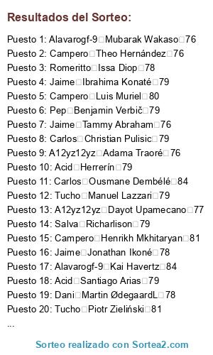 Lista de participantes: Tucho Antonio Mirante 79, Dani Aaron Wan-Bissaka 79, Carlos Abdou Diallo 79, Campero Abdoulaye Doucouré 81, Romeritto Achraf HakimiL 79, A12yz12yz Adama Traoré 76, Campero Alban LafontL 79, Javierux Aleksandar Kolarov 82, Romeritto Aleñá 76, Alavarogf-9 Alessandro Florenzi 81, Dani Alessio Cragno 81, Caveman Alex Meret 78, Campero Alex Oxlade-Chamberlain 80, Alavarogf-9 Alex Teixeira 79, Tucho Alexandr Golovin 79, Javierux Allan Saint-Maximin 79, Caveman Alphonse Areola 82, Carlos Ander Herrera 82, Salva André Gomes 80, Campero André Onana 82, Carlos Andrea Belotti 82, Carlos Andrey Lunev 79, A12yz12yz Andriy Lunin 76, Pep Ángel Correa 82, Javierux Angeliño 79, Alavarogf-9 Ante Rebić 80, Salva Antonio Rüdiger 82, Tucho Arthur Masuaku 76, Alavarogf-9 Badou Ndiaye 76, Jaime Benjamin Pavard 79, Jaime Benjamin Stambouli 79, Pep Benjamin Verbič 79, Romeritto Bertrand Traoré 78, Campero Bruma 78, Salva Callum Wilson 80, A12yz12yz Capa 78, Romeritto Cédric Bakambu 82, Jaime Cengiz Ünder 78, Salva Chris Smalling 80, Dani Christian Luyindama 77, Carlos Christian Pulisic 79, Pep Cristian Pavón 78, Tucho Damián Suárez 79, Salva Dan-Axel Zagadou 79, Carlos Dani CeballosL 81, Romeritto Dani Olmo 79, Acid Daniel Podence 78, Carlos Daniel Wass 80, A12yz12yz Daniele De Rossi 82, Tucho Daniele Rugani 82, Jaime Danilo 79, Pep Danny da Costa 79, Dani David Abraham 78, Acid David Neres 81, Javierux David Soria 82, A12yz12yz Dayot Upamecano 77, Carlos De Tomás 79, Acid DeAndre Yedlin 76, Pep Denis Cheryshev 79, Carlos Denis Zakaria 78, Tucho Denzel Dumfries 78, A12yz12yz Deulofeu 80, Romeritto Diego Carlos 79, Tucho Divock Origi 78, Salva Dominik Livaković 79, Caveman Donny van de Beek 81, A12yz12yz Douglas Costa 84, Acid Éder Militão 81, Dani Edgar Manuel Guichón 78, Carlos Eduardo Salvio 80, Javierux Eljero Elia 77, Alavarogf-9 Emmanuel Boateng 77, Caveman Emre Can 81, Pep Enzo Martín Riquero 79, Acid Eric Bailly 80, A12yz12yz Esteban Andrada 79, Acid Ezequiel Lavezzi 79, Javierux Federico Chiesa 79, Alavarogf-9 Ferland Mendy 80, Salva Franck Yannick Kessié 79, Alavarogf-9 Frank Acheampong 77, Alavarogf-9 Frank Fabra 77, Acid Fred 79, Caveman Gabriel Jesus 82, Pep Gabriel Paulista 82, Carlos Gayà 80, Salva Gelson Martins 82, Javierux Geoffrey Kondogbia 81, Alavarogf-9 Georgiy Dzhikiya 78, Alavarogf-9 Guaita 79, Campero Héctor Herrera 82, Campero Henrikh Mkhitaryan 81, Acid Henry Onyekuru 78, Acid Herrerín 79, Acid Hirving Lozano 82, Dani Houssem Aouar 81, Alavarogf-9 Ibrahim Amadou 78, Jaime Ibrahima Konaté 79, Alavarogf-9 Ike Opara 76, Campero Iñaki Williams 82, Caveman Ismaïla Sarr 78, Romeritto Issa Diop 78, Romeritto Jadon Sancho 84, Pep Jaime Nicolás Frendado 81, Pep Jamie Vardy 82, Acid Jason Denayer 79, Pep Jaume 76, Tucho Jean-Paul Boëtius 78, Acid Jean-Philippe Gbamin 79, Caveman Jefferson Lerma 79, Carlos Jeison MurilloL 79, Salva Jérôme Roussillon 82, Salva Jesse Lingard 82, A12yz12yz Jesús Navas 82, Alavarogf-9 Joakim Mæhle 77, Dani João Félix 80, Campero Joe Gomez 80, Caveman Joel Matip 82, Tucho Joel Robles 78, Romeritto John Brooks 79, Jaime Jonathan Ikoné 78, Caveman Jordan Lukaku 77, Dani Joshua King 79, Romeritto Juan Musso 78, Javierux Juiano Mestres 82, Jaime Julian Brandt 84, Acid Junior Firpo 79, Romeritto Justin Kluivert 76, Alavarogf-9 Kai Havertz 84, Romeritto Karim Bellarabi 82, Tucho Keita Baldé 80, Dani Kerem Demirbay 82, Carlos Kevin Mbabu 77, Tucho Kevin Vogt 80, Caveman Kevin Volland 82, A12yz12yz Kieran Tierney 76, Caveman Kingsley Coman 84, A12yz12yz Kurt Zouma 80, Dani Kyle Walker 84, Dani Lautaro Martínez 81, Romeritto Leandro Trossard 79, Alavarogf-9 Leon Bailey 82, Javierux Leonardo Pavoletti 78, Jaime Lorenzo Pellegrini 79, Dani Loris KariusL 79, Carlos Lucas Paquetá 79, Dani Luciano Acosta 76, Campero Luis Muriel 80, Campero Lukas Klostermann 79, Alavarogf-9 Łukasz Fabiański 82, A12yz12yz Malcom 82, Tucho Manuel Lazzari 79, Javierux Marcano 79, A12yz12yz Marcos Rojo 78, Salva Marcus Rashford 83, Pep Mariano 79, Javierux Mariano 79, Javierux Mario Hermoso 80, Pep Mário Rui 79, Dani Martin ØdegaardL 78, A12yz12yz Mateo Kovačić 82, Salva Matías Vargas 77, Caveman Matías Zaracho 78, Salva Mattia Perin 82, Campero Maxwel Cornet 76, Salva M'Baye Niang 77, Carlos Mbwana Ally Samatta 79, Javierux Memphis Depay 84, Caveman Michael Ngadeu-Ngadjui 78, A12yz12yz Michail Antonio 78, Campero Milot Rashica 79, Tucho Morales 81, Javierux Mouctar Diakhaby 77, Jaime Moussa Dembélé 79, Alavarogf-9 Moussa Marega 80, Acid Moussa Sissoko 81, Alavarogf-9 Mubarak Wakaso 76, Caveman Munir 79, Campero Naby Keïta 82, Dani Nacho Fernández 82, Caveman Nadiem Amiri 78, Acid Nahitan Nández 77, Jaime Nathan Aké 81, Romeritto Nélson Semedo 82, Javierux Nick Pope 79, Jaime Nico Schulz 82, Campero Nicolas Pépé 83, Tucho Nicolás Tagliafico 82, Pep Niklas Stark 79, Tucho Ogenyi Onazi 76, Romeritto Okay Yokuşlu 78, Carlos Ousmane Dembélé 84, Jaime Oyarzabal 82, Pep Paulinho 84, Jaime Pierluigi Gollini 76, Tucho Piotr Zieliński 81, Carlos Presnel Kimpembe 82, Javierux Quincy Promes 82, Romeritto Raphaelito Anjos 82, Salva Raphinha 79, Jaime Renan Lodi 77, Salva Renzo Saravia 78, Salva Richarlison 79, Carlos Rodrigo Bentancur 79, Pep Rodrygo 76, Dani Ross Barkley 79, Campero Rúben Dias 80, Pep Rúben Vezo 77, Javierux Ruslan Malinovskyi 79, Tucho Ryan Babel 78, A12yz12yz Sander Berge 79, Acid Santiago Arias 79, A12yz12yz Segundo Mandíquez 81, Caveman Serge Aurier 79, Caveman Sergi Roberto 82, Pep Sergio Asenjo 82, Javierux Simone Zaza 80, Dani Stanislav Lobotka 79, Dani Stephan El Shaarawy 82, Jaime Steven Bergwijn 82, Romeritto Taison 82, Jaime Tammy Abraham 76, Jaime Tanguy Ndombele 81, Campero Theo Hernández 76, Campero Thiago Mendes 81, Caveman Thilo Kehrer 79, Pep Thomas Delaney 82, Alavarogf-9 Thomas Meunier 82, Romeritto Thomas Partey 82, Carlos Thomas Strakosha 82, Tucho Tiémoué Bakayoko 80, Jaime Timo Horn 