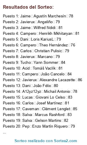 Lista de participantes: Dani Aaron Wan-Bissaka 79, Carlos Abdou Diallo 79, Campero Abdoulaye Doucouré 81, Jaime Achraf HakimiL 79, A12yz12yz Adama Traoré 76, Caveman Adrien Rabiot 83, Jaime Agustín Marchesín 78, Campero Alban LafontL 79, Dani Alejandro Gómez 85, Javierux Aleksandar Kolarov 82, Alavarogf-9 Alessandro Florenzi 81, Dani Alessio Cragno 81, Caveman Alex Meret 78, Campero Alex Oxlade-Chamberlain 80, Alavarogf-9 Alex Teixeira 79, Campero Alex Telles 84, Tucho Alexandr Golovin 79, Javierux Alexandre Lacazette 86, Pep Allan 85, Javierux Allan Saint-Maximin 79, Caveman Alphonse Areola 82, Carlos Ander Herrera 82, Salva André Gomes 80, Jaime André Onana 82, Carlos Andrea Belotti 82, Javierux Andrea Consigli 81, Caveman Andrej Kramarić 83, Carlos Andrey Lunev 79, A12yz12yz Andriy Lunin 76, Pep Ángel Correa 82, Lucas Ángel Di María 86, Javierux Angeliño 79, Alavarogf-9 Ante Rebić 80, Carlos Anthony Martial 83, Salva Antonio Rüdiger 82, Carlos Arthur 84, Tucho Arthur Masuaku 76, A12yz12yz Arturo Vidal 84, Carlos Azpilicueta 84, Alavarogf-9 Badou Ndiaye 76, Jaime Benjamin Pavard 79, Pep Benjamin Verbič 79, Javierux Bernat 80, Acid Bernd Leno 84, Campero Bruma 78, Acid Bruno Fernandes 85, A12yz12yz Capa 78, Pep Cédric Bakambu 82, Salva Chris Smalling 80, Dani Christian Luyindama 77, Carlos Christian Pulisic 79, Jaime Ciro Immobile 86, Caveman Clément Lenglet 85, Pep Cristian Pavón 78, Tucho Damián Suárez 79, Carlos Dani CeballosL 81, Tucho Daniele Rugani 82, Pep Danny da Costa 79, Dani David Abraham 78, Acid David Neres 81, Salva Davinson Sánchez 83, A12yz12yz Dayot Upamecano 77, Acid DeAndre Yedlin 76, Pep Denis Cheryshev 79, Carlos Denis Zakaria 78, Tucho Denzel Dumfries 78, A12yz12yz Deulofeu 80, A12yz12yz Diego Carlos 79, Tucho Divock Origi 78, Salva Dominik Livaković 79, Caveman Donny van de Beek 81, A12yz12yz Douglas Costa 84, Acid Éder Militão 81, Dani Edgar Manuel Guichón 78, Carlos Eduardo Salvio 80, Lucas Egidio Maestre Schetino 82, Carlos Elseid Hysaj 80, Caveman Emre Can 81, Pep Enzo Martín Riquero 79, Acid Eric Bailly 80, A12yz12yz Esteban Andrada 79, Lucas Éver Banega 83, Lucas Exequiel Palacios 77, Acid Ezequiel Lavezzi 79, Lucas Fabricio Bustos 77, Javierux Federico Valverde 77, Alavarogf-9 Ferland Mendy 80, Caveman Filip Kostić 82, Javierux Francis Coquelin 80, Salva Franck Yannick Kessié 79, Alavarogf-9 Frank Acheampong 77, Alavarogf-9 Frank Fabra 77, Acid Fred 79, Carlos Frenkie de Jong 85, Caveman Gabriel Jesus 82, Pep Gabriel Paulista 82, Alavarogf-9 Gareth Bale 85, Carlos Gayà 80, Salva Gelson Martins 82, Javierux Geoffrey Kondogbia 81, Alavarogf-9 Georgiy Dzhikiya 78, Lucas Gerónimo Rulli 81, Lucas Giovani Lo Celso 83, Tucho Grimaldo 83, Campero Héctor Herrera 82, Campero Henrikh Mkhitaryan 81, Acid Henry Onyekuru 78, Acid Hirving Lozano 82, Dani Houssem Aouar 81, Jaime Ibrahima Konaté 79, Jaime Idrissa Gueye 83, Campero Iñaki Williams 82, Lucas Jadon Sancho 84, Pep Jaime Nicolás Frendado 81, Pep Jamie Vardy 82, Pep Jaume 76, Tucho Jean-Paul Boëtius 78, Acid Jean-Philippe Gbamin 79, Javierux Jérôme Boateng 84, Salva Jérôme Roussillon 82, Salva Jesse Lingard 82, A12yz12yz Jesús Navas 82, Javierux Jiří Pavlenka 84, Alavarogf-9 Joakim Mæhle 77, Campero João Cancelo 84, Dani João Félix 80, Lucas Joaquín Correa 80, Campero Joe Gomez 80, Caveman Joel Matip 82, Tucho Joel Robles 78, Jaime Jonathan Ikoné 78, Caveman Jordan Lukaku 77, Campero Jordan Pickford 83, Carlos Josef Martínez 81, Acid Josué Chiamulera 83, Javierux Juan Cuadrado 83, Lucas Juan Musso 78, Jaime Julian Brandt 84, Caveman Julian Draxler 83, Acid Junior Firpo 79, Alavarogf-9 Kai Havertz 84, Caveman Karim Bellarabi 82, Tucho Keita Baldé 80, Alavarogf-9 Kepa 84, Dani Kerem Demirbay 82, Carlos Kevin Mbabu 77, Tucho Kevin Vogt 80, A12yz12yz Kieran Tierney 76, Caveman Kingsley Coman 84, A12yz12yz Kostas Manolas 85, Dani Kyle Walker 84, Dani Lautaro Martínez 81, Lucas Leandro Paredes 80, Caveman Leon Bailey 82, Alavarogf-9 Leon Goretzka 84, Javierux Leonardo Pavoletti 78, Lucas Leonardo Sigali 79, Tucho Leroy Sané 86, Lucas Lisandro López 81, Lucas Lisandro Martínez 77, Jaime Lorenzo Pellegrini 79, Dani Loris KariusL 79, Alavarogf-9 Lucas Hernández 84, Salva Lucas Moura 83, Campero Luis Muriel 80, Alavarogf-9 Łukasz Fabiański 82, Alavarogf-9 Manuel Akanji 83, Tucho Manuel Lazzari 79, Javierux Marcano 79, Lucas Marcos Acuña 81, Salva Marcus Rashford 83, Jaime Mario Hermoso 80, Pep Mário Rui 79, Campero Marouane Fellaini 76, Dani Martin ØdegaardL 78, A12yz12yz Mateo Kovačić 82, Salva Matías Vargas 77, Caveman Matías Zaracho 78, Salva Mattia Perin 82, Salva M'Baye Niang 77, Dani Memphis Depay 84, A12yz12yz Michail Antonio 78, Javierux Milot Rashica 79, Tucho Morales 81, Jaime Moussa Dembélé 79, Alavarogf-9 Moussa Marega 80, Acid Moussa Sissoko 81, Salva Nabil Fekir 84, Campero Naby Keïta 82, Dani Nacho Fernández 82, Jaime Nathan Aké 81, Lucas Nélson Semedo 82, Jaime Nico Schulz 82, Lucas Nicolás Otamendi 83, Campero Nicolas Pépé 83, Lucas Nicolás Tagliafico 82, Tucho Ogenyi Onazi 76, Carlos Ousmane Dembélé 84, Jaime Oyarzabal 82, Pep Paulinho 84, Tucho Piotr Zieliński 81, Carlos Presnel Kimpembe 82, Javierux Quincy Promes 82, Javierux Radja Nainggolan 83, Campero Raphaël Varane 85, Salva Raphinha 79, Caveman Renato Sanches 76, Salva Renzo Saravia 78, Caveman Ricardo Pereira 82, Salva Richarlison 79, Alavarogf-9 Riyad Mahrez 84, A12yz12yz Rodrigo 83, Pep Rodrygo 76, A12yz12yz Ronaldo Esler 78, Campero Rúben Dias 80, A12yz12yz Ryan Fraser 81, A12yz12yz Sander Berge 79, Acid Santiago Arias 79, Javierux Sebastian Giovinco 81, A12yz12yz Segundo Mandíquez 81, Campero Serge Gnabry 84, Dani Sergi Roberto 82, Pep Sergio Asenjo 82, Pep Sokratis 84, Dani Stanislav Lobotka 79, Dani Stephan El Shaarawy 82, Jaime Steven Bergwijn 82, Javierux Taison 82, Jaime Tanguy Ndombele 81, Campero Theo Hernández 76, Caveman Thilo Kehrer 79, Pep Thomas Delan