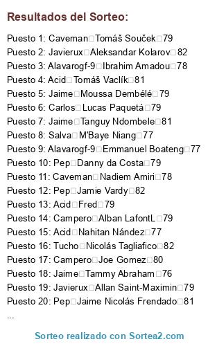 Lista de participantes: Dani Aaron Wan-Bissaka 79, Carlos Abdou Diallo 79, Campero Abdoulaye Doucouré 81, Jaime Achraf HakimiL 79, A12yz12yz Adama Traoré 76, Caveman Adrien Rabiot 83, Jaime Agustín Marchesín 78, Campero Alban LafontL 79, Dani Alejandro Gómez 85, Javierux Aleksandar Kolarov 82, Alavarogf-9 Alessandro Florenzi 81, Dani Alessio Cragno 81, Caveman Alex Meret 78, Campero Alex Oxlade-Chamberlain 80, Alavarogf-9 Alex Teixeira 79, Campero Alex Telles 84, Tucho Alexandr Golovin 79, Javierux Alexandre Lacazette 86, Pep Allan 85, Javierux Allan Saint-Maximin 79, Caveman Alphonse Areola 82, Carlos Ander Herrera 82, Salva André Gomes 80, Jaime André Onana 82, Carlos Andrea Belotti 82, Javierux Andrea Consigli 81, Caveman Andrej Kramarić 83, Carlos Andrey Lunev 79, A12yz12yz Andriy Lunin 76, Pep Ángel Correa 82, Lucas Ángel Di María 86, Javierux Angeliño 79, Alavarogf-9 Ante Rebić 80, Carlos Anthony Martial 83, Salva Antonio Rüdiger 82, Carlos Arthur 84, Tucho Arthur Masuaku 76, A12yz12yz Arturo Vidal 84, Carlos Azpilicueta 84, Alavarogf-9 Badou Ndiaye 76, Jaime Benjamin Pavard 79, Pep Benjamin Verbič 79, Javierux Bernat 80, Acid Bernd Leno 84, Campero Bruma 78, Acid Bruno Fernandes 85, A12yz12yz Capa 78, Pep Cédric Bakambu 82, Salva Chris Smalling 80, Dani Christian Luyindama 77, Carlos Christian Pulisic 79, Jaime Ciro Immobile 86, Caveman Clément Lenglet 85, Pep Cristian Pavón 78, Tucho Damián Suárez 79, Carlos Dani CeballosL 81, Tucho Daniele Rugani 82, Pep Danny da Costa 79, Dani David Abraham 78, Acid David Neres 81, Salva Davinson Sánchez 83, A12yz12yz Dayot Upamecano 77, Acid DeAndre Yedlin 76, Pep Denis Cheryshev 79, Carlos Denis Zakaria 78, Tucho Denzel Dumfries 78, A12yz12yz Deulofeu 80, A12yz12yz Diego Carlos 79, Tucho Divock Origi 78, Salva Dominik Livaković 79, Caveman Donny van de Beek 81, A12yz12yz Douglas Costa 84, Acid Éder Militão 81, Dani Edgar Manuel Guichón 78, Carlos Eduardo Salvio 80, Lucas Egidio Maestre Schetino 82, Carlos Elseid Hysaj 80, Caveman Emre Can 81, Pep Enzo Martín Riquero 79, Acid Eric Bailly 80, A12yz12yz Esteban Andrada 79, Lucas Éver Banega 83, Lucas Exequiel Palacios 77, Acid Ezequiel Lavezzi 79, Lucas Fabricio Bustos 77, Javierux Federico Valverde 77, Alavarogf-9 Ferland Mendy 80, Caveman Filip Kostić 82, Javierux Francis Coquelin 80, Salva Franck Yannick Kessié 79, Alavarogf-9 Frank Acheampong 77, Alavarogf-9 Frank Fabra 77, Acid Fred 79, Carlos Frenkie de Jong 85, Caveman Gabriel Jesus 82, Pep Gabriel Paulista 82, Alavarogf-9 Gareth Bale 85, Carlos Gayà 80, Salva Gelson Martins 82, Javierux Geoffrey Kondogbia 81, Alavarogf-9 Georgiy Dzhikiya 78, Lucas Gerónimo Rulli 81, Lucas Giovani Lo Celso 83, Tucho Grimaldo 83, Campero Héctor Herrera 82, Campero Henrikh Mkhitaryan 81, Acid Henry Onyekuru 78, Acid Hirving Lozano 82, Dani Houssem Aouar 81, Jaime Ibrahima Konaté 79, Jaime Idrissa Gueye 83, Campero Iñaki Williams 82, Lucas Jadon Sancho 84, Pep Jaime Nicolás Frendado 81, Pep Jamie Vardy 82, Pep Jaume 76, Tucho Jean-Paul Boëtius 78, Acid Jean-Philippe Gbamin 79, Javierux Jérôme Boateng 84, Salva Jérôme Roussillon 82, Salva Jesse Lingard 82, A12yz12yz Jesús Navas 82, Javierux Jiří Pavlenka 84, Alavarogf-9 Joakim Mæhle 77, Campero João Cancelo 84, Dani João Félix 80, Lucas Joaquín Correa 80, Campero Joe Gomez 80, Caveman Joel Matip 82, Tucho Joel Robles 78, Jaime Jonathan Ikoné 78, Caveman Jordan Lukaku 77, Campero Jordan Pickford 83, Carlos Josef Martínez 81, Acid Josué Chiamulera 83, Javierux Juan Cuadrado 83, Lucas Juan Musso 78, Jaime Julian Brandt 84, Caveman Julian Draxler 83, Acid Junior Firpo 79, Alavarogf-9 Kai Havertz 84, Caveman Karim Bellarabi 82, Tucho Keita Baldé 80, Alavarogf-9 Kepa 84, Dani Kerem Demirbay 82, Carlos Kevin Mbabu 77, Tucho Kevin Vogt 80, A12yz12yz Kieran Tierney 76, Caveman Kingsley Coman 84, A12yz12yz Kostas Manolas 85, Dani Kyle Walker 84, Dani Lautaro Martínez 81, Lucas Leandro Paredes 80, Caveman Leon Bailey 82, Alavarogf-9 Leon Goretzka 84, Javierux Leonardo Pavoletti 78, Lucas Leonardo Sigali 79, Tucho Leroy Sané 86, Lucas Lisandro López 81, Lucas Lisandro Martínez 77, Jaime Lorenzo Pellegrini 79, Dani Loris KariusL 79, Alavarogf-9 Lucas Hernández 84, Salva Lucas Moura 83, Campero Luis Muriel 80, Alavarogf-9 Łukasz Fabiański 82, Alavarogf-9 Manuel Akanji 83, Tucho Manuel Lazzari 79, Javierux Marcano 79, Lucas Marcos Acuña 81, Salva Marcus Rashford 83, Jaime Mario Hermoso 80, Pep Mário Rui 79, Campero Marouane Fellaini 76, Dani Martin ØdegaardL 78, A12yz12yz Mateo Kovačić 82, Salva Matías Vargas 77, Caveman Matías Zaracho 78, Salva Mattia Perin 82, Salva M'Baye Niang 77, Dani Memphis Depay 84, A12yz12yz Michail Antonio 78, Javierux Milot Rashica 79, Tucho Morales 81, Jaime Moussa Dembélé 79, Alavarogf-9 Moussa Marega 80, Acid Moussa Sissoko 81, Salva Nabil Fekir 84, Campero Naby Keïta 82, Dani Nacho Fernández 82, Jaime Nathan Aké 81, Lucas Nélson Semedo 82, Jaime Nico Schulz 82, Lucas Nicolás Otamendi 83, Campero Nicolas Pépé 83, Lucas Nicolás Tagliafico 82, Tucho Ogenyi Onazi 76, Carlos Ousmane Dembélé 84, Jaime Oyarzabal 82, Pep Paulinho 84, Tucho Piotr Zieliński 81, Carlos Presnel Kimpembe 82, Javierux Quincy Promes 82, Javierux Radja Nainggolan 83, Campero Raphaël Varane 85, Salva Raphinha 79, Caveman Renato Sanches 76, Salva Renzo Saravia 78, Caveman Ricardo Pereira 82, Salva Richarlison 79, Alavarogf-9 Riyad Mahrez 84, A12yz12yz Rodrigo 83, Pep Rodrygo 76, A12yz12yz Ronaldo Esler 78, Campero Rúben Dias 80, A12yz12yz Ryan Fraser 81, A12yz12yz Sander Berge 79, Acid Santiago Arias 79, Javierux Sebastian Giovinco 81, A12yz12yz Segundo Mandíquez 81, Campero Serge Gnabry 84, Dani Sergi Roberto 82, Pep Sergio Asenjo 82, Pep Sokratis 84, Dani Stanislav Lobotka 79, Dani Stephan El Shaarawy 82, Jaime Steven Bergwijn 82, Javierux Taison 82, Jaime Tanguy Ndombele 81, Campero Theo Hernández 76, Caveman Thilo Kehrer 79, Pep Thomas Delan