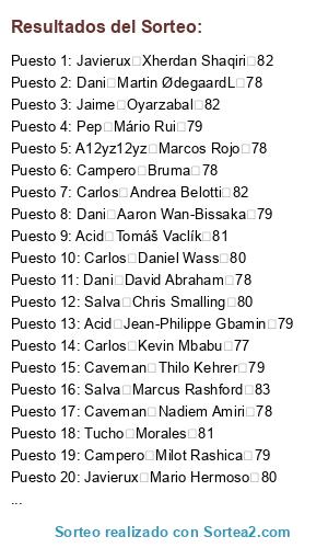 Lista de participantes: Dani Aaron Wan-Bissaka 79, Carlos Abdou Diallo 79, Campero Abdoulaye Doucouré 81, Jaime Achraf HakimiL 79, A12yz12yz Adama Traoré 76, Caveman Adrien Rabiot 83, Jaime Agustín Marchesín 78, Campero Alban LafontL 79, Dani Alejandro Gómez 85, Javierux Aleksandar Kolarov 82, Alavarogf-9 Alessandro Florenzi 81, Dani Alessio Cragno 81, Caveman Alex Meret 78, Campero Alex Oxlade-Chamberlain 80, Alavarogf-9 Alex Teixeira 79, Campero Alex Telles 84, Tucho Alexandr Golovin 79, Javierux Alexandre Lacazette 86, Pep Allan 85, Javierux Allan Saint-Maximin 79, Caveman Alphonse Areola 82, Carlos Ander Herrera 82, Salva André Gomes 80, Jaime André Onana 82, Carlos Andrea Belotti 82, Javierux Andrea Consigli 81, Caveman Andrej Kramarić 83, Carlos Andrey Lunev 79, A12yz12yz Andriy Lunin 76, Pep Ángel Correa 82, Lucas Ángel Di María 86, Javierux Angeliño 79, Alavarogf-9 Ante Rebić 80, Carlos Anthony Martial 83, Salva Antonio Rüdiger 82, Carlos Arthur 84, Tucho Arthur Masuaku 76, A12yz12yz Arturo Vidal 84, Carlos Azpilicueta 84, Alavarogf-9 Badou Ndiaye 76, Jaime Benjamin Pavard 79, Pep Benjamin Verbič 79, Javierux Bernat 80, Acid Bernd Leno 84, Campero Bruma 78, Acid Bruno Fernandes 85, A12yz12yz Capa 78, Pep Cédric Bakambu 82, Salva Chris Smalling 80, Dani Christian Luyindama 77, Carlos Christian Pulisic 79, Jaime Ciro Immobile 86, Caveman Clément Lenglet 85, Pep Cristian Pavón 78, Tucho Damián Suárez 79, Carlos Dani CeballosL 81, Tucho Daniele Rugani 82, Pep Danny da Costa 79, Dani David Abraham 78, Acid David Neres 81, Salva Davinson Sánchez 83, A12yz12yz Dayot Upamecano 77, Acid DeAndre Yedlin 76, Pep Denis Cheryshev 79, Carlos Denis Zakaria 78, Tucho Denzel Dumfries 78, A12yz12yz Deulofeu 80, A12yz12yz Diego Carlos 79, Tucho Divock Origi 78, Salva Dominik Livaković 79, Caveman Donny van de Beek 81, A12yz12yz Douglas Costa 84, Acid Éder Militão 81, Dani Edgar Manuel Guichón 78, Carlos Eduardo Salvio 80, Lucas Egidio Maestre Schetino 82, Carlos Elseid Hysaj 80, Caveman Emre Can 81, Pep Enzo Martín Riquero 79, Acid Eric Bailly 80, A12yz12yz Esteban Andrada 79, Lucas Éver Banega 83, Lucas Exequiel Palacios 77, Acid Ezequiel Lavezzi 79, Lucas Fabricio Bustos 77, Javierux Federico Valverde 77, Alavarogf-9 Ferland Mendy 80, Caveman Filip Kostić 82, Javierux Francis Coquelin 80, Salva Franck Yannick Kessié 79, Alavarogf-9 Frank Acheampong 77, Alavarogf-9 Frank Fabra 77, Acid Fred 79, Carlos Frenkie de Jong 85, Caveman Gabriel Jesus 82, Pep Gabriel Paulista 82, Alavarogf-9 Gareth Bale 85, Carlos Gayà 80, Salva Gelson Martins 82, Javierux Geoffrey Kondogbia 81, Alavarogf-9 Georgiy Dzhikiya 78, Lucas Gerónimo Rulli 81, Lucas Giovani Lo Celso 83, Tucho Grimaldo 83, Campero Héctor Herrera 82, Campero Henrikh Mkhitaryan 81, Acid Henry Onyekuru 78, Acid Hirving Lozano 82, Dani Houssem Aouar 81, Jaime Ibrahima Konaté 79, Jaime Idrissa Gueye 83, Campero Iñaki Williams 82, Lucas Jadon Sancho 84, Pep Jaime Nicolás Frendado 81, Pep Jamie Vardy 82, Pep Jaume 76, Tucho Jean-Paul Boëtius 78, Acid Jean-Philippe Gbamin 79, Javierux Jérôme Boateng 84, Salva Jérôme Roussillon 82, Salva Jesse Lingard 82, A12yz12yz Jesús Navas 82, Javierux Jiří Pavlenka 84, Alavarogf-9 Joakim Mæhle 77, Campero João Cancelo 84, Dani João Félix 80, Lucas Joaquín Correa 80, Campero Joe Gomez 80, Caveman Joel Matip 82, Tucho Joel Robles 78, Jaime Jonathan Ikoné 78, Caveman Jordan Lukaku 77, Campero Jordan Pickford 83, Carlos Josef Martínez 81, Acid Josué Chiamulera 83, Javierux Juan Cuadrado 83, Lucas Juan Musso 78, Jaime Julian Brandt 84, Caveman Julian Draxler 83, Acid Junior Firpo 79, Alavarogf-9 Kai Havertz 84, Caveman Karim Bellarabi 82, Tucho Keita Baldé 80, Alavarogf-9 Kepa 84, Dani Kerem Demirbay 82, Carlos Kevin Mbabu 77, Tucho Kevin Vogt 80, A12yz12yz Kieran Tierney 76, Caveman Kingsley Coman 84, A12yz12yz Kostas Manolas 85, Dani Kyle Walker 84, Dani Lautaro Martínez 81, Lucas Leandro Paredes 80, Caveman Leon Bailey 82, Alavarogf-9 Leon Goretzka 84, Javierux Leonardo Pavoletti 78, Lucas Leonardo Sigali 79, Tucho Leroy Sané 86, Lucas Lisandro López 81, Lucas Lisandro Martínez 77, Jaime Lorenzo Pellegrini 79, Dani Loris KariusL 79, Alavarogf-9 Lucas Hernández 84, Salva Lucas Moura 83, Campero Luis Muriel 80, Alavarogf-9 Łukasz Fabiański 82, Alavarogf-9 Manuel Akanji 83, Tucho Manuel Lazzari 79, Javierux Marcano 79, Lucas Marcos Acuña 81, Salva Marcus Rashford 83, Jaime Mario Hermoso 80, Pep Mário Rui 79, Campero Marouane Fellaini 76, Dani Martin ØdegaardL 78, A12yz12yz Mateo Kovačić 82, Salva Matías Vargas 77, Caveman Matías Zaracho 78, Salva Mattia Perin 82, Salva M'Baye Niang 77, Dani Memphis Depay 84, A12yz12yz Michail Antonio 78, Javierux Milot Rashica 79, Tucho Morales 81, Jaime Moussa Dembélé 79, Alavarogf-9 Moussa Marega 80, Acid Moussa Sissoko 81, Salva Nabil Fekir 84, Campero Naby Keïta 82, Dani Nacho Fernández 82, Jaime Nathan Aké 81, Lucas Nélson Semedo 82, Jaime Nico Schulz 82, Lucas Nicolás Otamendi 83, Campero Nicolas Pépé 83, Lucas Nicolás Tagliafico 82, Tucho Ogenyi Onazi 76, Carlos Ousmane Dembélé 84, Jaime Oyarzabal 82, Pep Paulinho 84, Tucho Piotr Zieliński 81, Carlos Presnel Kimpembe 82, Javierux Quincy Promes 82, Javierux Radja Nainggolan 83, Campero Raphaël Varane 85, Salva Raphinha 79, Caveman Renato Sanches 76, Salva Renzo Saravia 78, Caveman Ricardo Pereira 82, Salva Richarlison 79, Alavarogf-9 Riyad Mahrez 84, A12yz12yz Rodrigo 83, Pep Rodrygo 76, A12yz12yz Ronaldo Esler 78, Campero Rúben Dias 80, A12yz12yz Ryan Fraser 81, A12yz12yz Sander Berge 79, Acid Santiago Arias 79, Javierux Sebastian Giovinco 81, A12yz12yz Segundo Mandíquez 81, Campero Serge Gnabry 84, Dani Sergi Roberto 82, Pep Sergio Asenjo 82, Pep Sokratis 84, Dani Stanislav Lobotka 79, Dani Stephan El Shaarawy 82, Jaime Steven Bergwijn 82, Javierux Taison 82, Jaime Tanguy Ndombele 81, Campero Theo Hernández 76, Caveman Thilo Kehrer 79, Pep Thomas Delan
