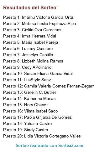 Lista de participantes: Adriana Ramos , Aixa Tanco, Alejandra Jimenez Deffit, Alexandra Sanchez, Alize Ali, Almendra Fuentes, Analy Morales Rivas , Andrea Duda, Andrea Ramirez, Andres Zambrano , Anita VqzPdo, Anyela Javier, Araceli Flores, Araceli Ibañez, Ariana Rivera Huaman, Arnold Soto, Audrid Mesia, Aveja Arr Cieza Linares, Betzabeth Garcia, Bg Carito, Brenda Del Pilar Moreno Atalaya, Bych Con Judith J Vasquez, Camila Valeria Gomez Fernan-Zegarra, Cardenas Olivia, Carmen Ramírez Valdivieso, Carmen Rosa Toledo Vilchez, Cecy APolinario, CielitolOza Cardenas, Cindy Pinto, Clarex Flores, Clarita Flores, Clau Klaus, Cris Elizabeth Labrin Ramirez, Dadelro Ram Romero, DEli Gonzales, Denisse Cano, DFantasynails Eyelashes, Edilia Lorena, Elenita FC, Eliza Lopez, Elizabeth Rey, Emma OH, Erika Gutierrez, Erika Johanny Sanz, Eva Dela Cruz, Evelyn Freitez, Evelyn Sáenz Instituto De Cosmetología Eirl, Fiorella Calderón, Flor Blas, Francia Fl, Gerelin C. Butiler, Giuliana Lazo Brissolese, Gladys Cordova Coello, Imarhu Victoria Garcia Ortiz, Irma Herrera Vidal, Isabel Flores Ore, Janet Sai Leong, Janeth Castillo, Janeth Ruiz Valles , Jeannie Choque, Jeniffer Vr, Jenny León Lobo, Jenny Román Galindo, Jennyfer Lopez , Jessica Chio Villegas Rodriguez, Jhio Carrera, Joselinne Nieves, Josselyn Castillo, Jovana Garca, Juliana Gomez de Soria, Karel Aguilar, Karin Del Rosario Arias Perez , Karina Nakura, Kateryn Guerrero A, Katherine Aparcana Ccoyllo , Katherine Macas, Katherine Rada G, Katia Yamunaque Pizarro, Katie Pérez Garay, Kattya Vicente, Katya Benavides, Kely Catherine Espinoza Chavez, Kristel Book Nail , Lady Elizabeth Juarez, Layleth Mendoza, Lesly PC, Lidia Victoria Cortegano Valles, Linda Katherine Diaz, Linda Milagros Minaya Leon, Lisbet Edith Carhuayo Liza, Lizbeth Castañeda Pomasoncco, Lizbeth Molina Ramos, Loly Mescua Bravo, Lourdes Verastegui Quintana, LuaStyle Sanz, Lucecita Vasquez Cieza, Lucero Curasma, Luka Muñoz Ramos, Luu De Saavedra, Luzney Quintero, Madeley García Jara, Maoly Morales, Maria Isabel Pareja, Mariacleyda Ramirez, Marie Chavez, Marina Mamani Arirama , Martha Estrella Manuyama, Maryori Cotrina, Melissa Leslie Espinoza Pipa, Meliza Araujo Valdez, Milagritos Imán Arrué, Milagros Durand Urbina, Mireya Gutierrez Ruiz, Naida Paucar, Naomi Vildoso Villarreyes, Nataly Pardo, Nicole Carhuancho, Nieves Vargas Rengifo, Noelia Tovar Rios, Nory Chavez, Pamela Medina P, Paola Celeste Celeste, Paola Grijalba De Gómez, Patricia Cahuaza, Patricia Nunura, Rosa Garcia Morales, Rosa Virginia Romero Borges, Rosali Quiroz, Roxana Huaman, Roxana Romero, Rrm Yosselin, Rs Luciana, Sab TC, Sandra Zuta Ruiz, Sara R. Melgarejo , Sheyla Nataly Luna Lopez, Shirley Agnes Lozano Rodriguez, Silvana Diaz, Sindy Castro, Sinthia Rosario Ramos Quispe, Solanch Oceda, Sulma Toledo Romani, Susan Eliana Garcia Vidal, Tarapoto Juli, Urquizo Yeniifer, Valeria Kr, Vanessita Ml, Veronica Santillán Reyes, Vilma Isabel Saco, Xana Martínez, Xiomara Suavo Che, Yahaira Castro, Yaye Lytana.
