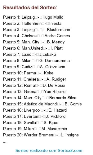 Lista de participantes: West Ham - Luis Suarez, West Ham - Falcao, West Ham - D. Payet, West Ham - D. Subasic, West Ham - K. Glik, West Ham - A. Valencia, West Ham - J. Seri, West Ham - D. Vida, West Ham - D. Rose, West Ham - Emre Can, West Ham - D. Benaglio, West Ham - J. Aholou, West Ham - F. Bustos, West Ham - Lekue, West Ham - A. Raggi, West Ham - A. Barreca, West Ham - S. Grandsir, West Ham - Jordi Mboula, West Ham - P. Pellegri, Werder Bremen - E. Cavani, Werder Bremen - M. Salah, Werder Bremen - L. Insigne, Werder Bremen - Fabinho, Werder Bremen - Luiz Gustavo, Werder Bremen - Adan, Werder Bremen - O. Toprak, Werder Bremen - M. Gotze, Werder Bremen - R. Burki, Werder Bremen - D. Criscito, Werder Bremen - S. Verdi, Werder Bremen - W. Ndidi, Werder Bremen - M. Almiron, Werder Bremen - M. Dahoud, Werder Bremen - R. Centurion, Werder Bremen - I. Smolnikov, Werder Bremen - A. Diallo, Werder Bremen - R. Guerreiro, Werder Bremen - J. Toljan, Werder Bremen - E. Oelschlagel, Werder Bremen - T. Kucz, Villarreal - H. Kane, Villarreal - Marquinhos, Villarreal - Victor Ruiz, Villarreal - Anderson Talisca, Villarreal - Felipe Anderson, Villarreal - Pablo Fornals, Villarreal - Bruno Soriano, Villarreal - Mario Gaspar, Villarreal - K. Toko-Ekambi, Villarreal - J. Butland, Villarreal - V. Wanyama, Villarreal - Alvaro, Villarreal - Jaume Costa, Villarreal - P. Piatti, Villarreal - Paco Alcacer, Villarreal - M. Layun, Villarreal - Javi Fuego, Villarreal - Pedraza, Villarreal - M. Barbosa, Villarreal - R. Guerra, Villarreal - Ruben Mesa, Villarreal - Roger Riera, Valencia - L. Sane, Valencia - R. Nainggolan, Valencia - Pepe, Valencia - Neto, Valencia - L. Goretzka, Valencia - Gabriel Paulista, Valencia - D. Wass, Valencia - Gonzalo Guedes, Valencia - J. Murillo, Valencia - M. Batshuayi, Valencia - K. Gameiro, Valencia - Hulk, Valencia - Ricardo Pereira, Valencia - Carlos Soler, Valencia - Gaya, Valencia - F. Coquelin, Valencia - C. Piccini, Valencia - Jaume, Valencia - Lato, Valencia - M. Diakhaby, Valencia - A. Musa, Valencia - Ferran Torres, Valencia - C. Rivero, Tottenham - H. Lloris, Tottenham - C. Eriksen, Tottenham - J. Vertonghen, Tottenham - R. Lukaku, Tottenham - J. Boateng, Tottenham - T. Muller, Tottenham - D. Sanchez, Tottenham - M. Dembele, Tottenham - Y. Carrasco, Tottenham - L. Hernandez, Tottenham - K. Trippier, Tottenham - A. Witsel, Tottenham - B. Davies, Tottenham - J. Ilicic, Tottenham - A. Oxlade-Chamberlain, Tottenham - M. Marega, Tottenham - I. Traore, Tottenham - M. Vorm, Tottenham - M. Sissoko, Tottenham - Theo Hernandez, Tottenham - R. Karsdorp, Tottenham - B. Henrichs, Tottenham - P. Gazzaniga, Sheffield Wednesday - Diego Costa, Sheffield Wednesday - Bruno Fernandes, Sheffield Wednesday - B. Dost, Sheffield Wednesday - E. Viviano, Sheffield Wednesday - K. Coman, Sheffield Wednesday - S. Coates, Sheffield Wednesday - T. Partey, Sheffield Wednesday - S. Sane, Sheffield Wednesday - Nani, Sheffield Wednesday - B. Pavard, Sheffield Wednesday - Raphinha, Sheffield Wednesday - R. Battaglia, Sheffield Wednesday - N. Ake, Sheffield Wednesday - H. Sakai, Sheffield Wednesday - Jefferson, Sheffield Wednesday - N. Gudelj, Sheffield Wednesday - Andre Pinto, Sheffield Wednesday - R. Petrovic, Sheffield Wednesday - S. Sturaro, Sheffield Wednesday - Wendel, Sheffield Wednesday - R. Salin, Sheffield Wednesday - Jovane Cabral, Sheffield Wednesday - M. Guendouzi, Sevilla - Y. Brahimi, Sevilla - Miranda, Sevilla - S. Khedira, Sevilla - Morata, Sevilla - F. Vazquez, Sevilla - Pablo Sarabia, Sevilla - G. Xhaka, Sevilla - Nolito, Sevilla - Maximiliano Gómez, Sevilla - Denis Suarez, Sevilla - S. Kjaer, Sevilla - Escudero, Sevilla - Jesus Navas, Sevilla - G. Mercado, Sevilla - Roque Mesa, Sevilla - T. Vaclik, Sevilla - Sergi Gomez, Sevilla - J. Gnagnon, Sevilla - Aleix Vidal, Sevilla - Andre Silva, Sevilla - I. Amadou, Sevilla - Arana, Sevilla - Soriano, Schalke 04 - M. Neuer, Schalke 04 - Isco, Schalke 04 - Thiago, Schalke 04 - M. Depay, Schalke 04 - M. Nastasic, Schalke 04 - S. Rudy, Schalke 04 - W. Ben Yedder, Schalke 04 - D. Sturridge, Schalke 04 - D. Caligiuri, Schalke 04 - M. Uth, Schalke 04 - P. cech, Schalke 04 - Omar Mascarell, Schalke 04 - Y. Konoplyanka, Schalke 04 - G. Burgstaller, Schalke 04 - N. Bentaleb, Schalke 04 - A. Harit, Schalke 04 - B. Stambouli, Schalke 04 - A. Schopf, Schalke 04 - B. Oczipka, Schalke 04 - A. Baba, Schalke 04 - B. Embolo, Schalke 04 - F. Di Santo, Schalke 04 - A. Nubel, Sampdoria - S. Mandanda, Sampdoria - E. Hysaj, Sampdoria - J. Guilavogui, Sampdoria - G. Pezzella, Sampdoria - D. Benedetto, Sampdoria - Y. Tielemans, Sampdoria - R. Zieler, Sampdoria - W. Barrios, Sampdoria - N. Amiri, Sampdoria - P. Sisto, Sampdoria - E. Rigoni, Sampdoria - A. Ogbonna, Sampdoria - W. Cyprien, Sampdoria - F. Kamano, Sampdoria - C. Sanchez, Sampdoria - R. Aguilar, Sampdoria - G. Defrel, Sampdoria - Alberto Moreno, Sampdoria - K. Akpoguma, Sampdoria - A. Younes, Sampdoria - A. Elis, Sampdoria - I. Opara, Sampdoria - M. Casco, Roma - K. Manolas, Roma - Sergio Asenjo, Roma - M. Mandzukic, Roma - Jose Callejon, Roma - David Luiz, Roma - D. De Rossi, Roma - A. Florenzi, Roma - F. Fazio, Roma - A. Kolarov, Roma - J. Pastore, Roma - S. Nzonzi, Roma - Marcano, Roma - S. El Shaarawy, Roma - D. Perotti, Roma - C. Tosun, Roma - M. Brozovic, Roma - A. Mirante, Roma - Lucas Perez, Roma - B. Cristante, Roma - L. Pellegrini, Roma - P. Schick, Roma - A. Coric, Roma - D. Santon, Real Madrid - Sergio Ramos, Real Madrid - L. Modric, Real Madrid - T. Courtois, Real Madrid - T. Kroos, Real Madrid - S. Aguero, Real Madrid - Marcelo, Real Madrid - G. Bale, Real Madrid - K. Navas, Real Madrid - R. Varane, Real Madrid - J. Kimmich, Real Madrid - Carvajal, Real Madrid - Nacho Fernandez, Real Madrid - W. Zaha, Real Madrid - Deulofeu, Real Madrid - Odriozola, Real Madrid - Marcos Llorente, Real Madrid - Vallejo, Real Madrid - Dani Ceballos, Real Madrid - H. Villalba, Real Madrid - Reguilon, Parma - Sergi