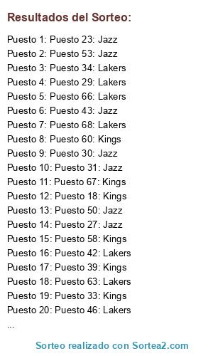 Lista de participantes: Puesto 1: Kings, Puesto 2: Kings, Puesto 3: Kings, Puesto 4: Jazz, Puesto 5: Lakers, Puesto 6: Kings, Puesto 7: Kings, Puesto 8: Kings, Puesto 9: Jazz, Puesto 10: Jazz, Puesto 11: Kings, Puesto 12: Jazz, Puesto 13: Jazz, Puesto 14: Jazz, Puesto 15: Jazz, Puesto 16: Lakers, Puesto 17: Jazz, Puesto 18: Kings, Puesto 19: Lakers, Puesto 20: Lakers, Puesto 21: Kings, Puesto 22: Lakers, Puesto 23: Jazz, Puesto 24: Lakers, Puesto 25: Lakers, Puesto 26: Lakers, Puesto 27: Jazz, Puesto 28: Kings, Puesto 29: Lakers, Puesto 30: Jazz, Puesto 31: Jazz, Puesto 32: Kings, Puesto 33: Kings, Puesto 34: Lakers, Puesto 35: Jazz, Puesto 36: Jazz, Puesto 37: Jazz, Puesto 38: Jazz, Puesto 39: Kings, Puesto 40: Kings, Puesto 41: Jazz, Puesto 42: Lakers, Puesto 43: Jazz, Puesto 44: Lakers, Puesto 45: Lakers, Puesto 46: Lakers, Puesto 47: Lakers, Puesto 48: Jazz, Puesto 49: Lakers, Puesto 50: Jazz, Puesto 51: Kings, Puesto 52: Jazz, Puesto 53: Jazz, Puesto 54: Kings, Puesto 55: Kings, Puesto 56: Lakers, Puesto 57: Kings, Puesto 58: Kings, Puesto 59: Jazz, Puesto 60: Kings, Puesto 61: Jazz, Puesto 62: Jazz, Puesto 63: Lakers, Puesto 64: Lakers, Puesto 65: Lakers, Puesto 66: Lakers, Puesto 67: Kings, Puesto 68: Lakers.