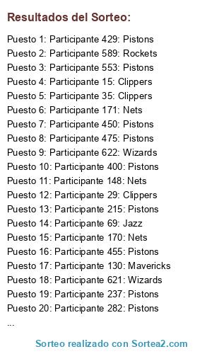 Lista de participantes: Participante 1: Clippers, Participante 2: Clippers, Participante 3: Clippers, Participante 4: Clippers, Participante 5: Clippers, Participante 6: Clippers, Participante 7: Clippers, Participante 8: Clippers, Participante 9: Clippers, Participante 10: Clippers, Participante 11: Clippers, Participante 12: Clippers, Participante 13: Clippers, Participante 14: Clippers, Participante 15: Clippers, Participante 16: Clippers, Participante 17: Clippers, Participante 18: Clippers, Participante 19: Clippers, Participante 20: Clippers, Participante 21: Clippers, Participante 22: Clippers, Participante 23: Clippers, Participante 24: Clippers, Participante 25: Clippers, Participante 26: Clippers, Participante 27: Clippers, Participante 28: Clippers, Participante 29: Clippers, Participante 30: Clippers, Participante 31: Clippers, Participante 32: Clippers, Participante 33: Clippers, Participante 34: Clippers, Participante 35: Clippers, Participante 36: Clippers, Participante 37: Clippers, Participante 38: Clippers, Participante 39: Clippers, Participante 40: Clippers, Participante 41: Clippers, Participante 42: Jazz, Participante 43: Jazz, Participante 44: Jazz, Participante 45: Jazz, Participante 46: Jazz, Participante 47: Jazz, Participante 48: Jazz, Participante 49: Jazz, Participante 50: Jazz, Participante 51: Jazz, Participante 52: Jazz, Participante 53: Jazz, Participante 54: Jazz, Participante 55: Jazz, Participante 56: Jazz, Participante 57: Jazz, Participante 58: Jazz, Participante 59: Jazz, Participante 60: Jazz, Participante 61: Jazz, Participante 62: Jazz, Participante 63: Jazz, Participante 64: Jazz, Participante 65: Jazz, Participante 66: Jazz, Participante 67: Jazz, Participante 68: Jazz, Participante 69: Jazz, Participante 70: Jazz, Participante 71: Jazz, Participante 72: Jazz, Participante 73: Jazz, Participante 74: Jazz, Participante 75: Jazz, Participante 76: Jazz, Participante 77: Jazz, Participante 78: Jazz, Participante 79: Jazz, Participante 80: Jazz, Participante 81: Jazz, Participante 82: Jazz, Participante 83: Jazz, Participante 84: Jazz, Participante 85: Jazz, Participante 86: Jazz, Participante 87: Jazz, Participante 88: Jazz, Participante 89: Jazz, Participante 90: Jazz, Participante 91: Jazz, Participante 92: Jazz, Participante 93: Jazz, Participante 94: Jazz, Participante 95: Jazz, Participante 96: Jazz, Participante 97: Jazz, Participante 98: Jazz, Participante 99: Jazz, Participante 100: Jazz, Participante 101: Jazz, Participante 102: Jazz, Participante 103: Mavericks, Participante 104: Mavericks, Participante 105: Mavericks, Participante 106: Mavericks, Participante 107: Mavericks, Participante 108: Mavericks, Participante 109: Mavericks, Participante 110: Mavericks, Participante 111: Mavericks, Participante 112: Mavericks, Participante 113: Mavericks, Participante 114: Mavericks, Participante 115: Mavericks, Participante 116: Mavericks, Participante 117: Mavericks, Participante 118: Mavericks, Participante 119: Mavericks, Participante 120: Mavericks, Participante 121: Mavericks, Participante 122: Mavericks, Participante 123: Mavericks, Participante 124: Mavericks, Participante 125: Mavericks, Participante 126: Mavericks, Participante 127: Mavericks, Participante 128: Mavericks, Participante 129: Mavericks, Participante 130: Mavericks, Participante 131: Mavericks, Participante 132: Mavericks, Participante 133: Mavericks, Participante 134: Mavericks, Participante 135: Mavericks, Participante 136: Mavericks, Participante 137: Mavericks, Participante 138: Mavericks, Participante 139: Mavericks, Participante 140: Mavericks, Participante 141: Mavericks, Participante 142: Nets, Participante 143: Nets, Participante 144: Nets, Participante 145: Nets, Participante 146: Nets, Participante 147: Nets, Participante 148: Nets, Participante 149: Nets, Participante 150: Nets, Participante 151: Nets, Participante 152: Nets, Participante 153: Nets, Participante 154: Nets, Participante 155: Nets, Participante 156: Nets, Participante 157: Nets, Participante 158: Nets, Participante 159: Nets, Participante 160: Nets, Participante 161: Nets, Participante 162: Nets, Participante 163: Nets, Participante 164: Nets, Participante 165: Nets, Participante 166: Nets, Participante 167: Nets, Participante 168: Nets, Participante 169: Nets, Participante 170: Nets, Participante 171: Nets, Participante 172: Nets, Participante 173: Nets, Participante 174: Nets, Participante 175: Nets, Participante 176: Nets, Participante 177: Nets, Participante 178: Nets, Participante 179: Pistons, Participante 180: Pistons, Participante 181: Pistons, Participante 182: Pistons, Participante 183: Pistons, Participante 184: Pistons, Participante 185: Pistons, Participante 186: Pistons, Participante 187: Pistons, Participante 188: Pistons, Participante 189: Pistons, Participante 190: Pistons, Participante 191: Pistons, Participante 192: Pistons, Participante 193: Pistons, Participante 194: Pistons, Participante 195: Pistons, Participante 196: Pistons, Participante 197: Pistons, Participante 198: Pistons, Participante 199: Pistons, Participante 200: Pistons, Participante 201: Pistons, Participante 202: Pistons, Participante 203: Pistons, Participante 204: Pistons, Participante 205: Pistons, Participante 206: Pistons, Participante 207: Pistons, Participante 208: Pistons, Participante 209: Pistons, Participante 210: Pistons, Participante 211: Pistons, Participante 212: Pistons, Participante 213: Pistons, Participante 214: Pistons, Participante 215: Pistons, Participante 216: Pistons, Participante 217: Pistons, Participante 218: Pistons, Participante 219: Pistons, Participante 220: Pistons, Participante 221: Pistons, Participante 222: Pistons, Participante 223: Pistons, Participante 224: Pistons, Participante 225: Pistons, Participante 226: Pistons, Participante 227: Pistons, Participante 228: Pistons, Participante 229: Pistons, Participante 230: Pistons, Participante 231: Pistons, Participante 232: Pist