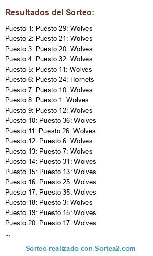 Lista de participantes: Puesto 1: Wolves, Puesto 2: Hornets, Puesto 3: Wolves, Puesto 4: Wolves, Puesto 5: Hornets, Puesto 6: Wolves, Puesto 7: Wolves, Puesto 8: Hornets, Puesto 9: Hornets, Puesto 10: Wolves, Puesto 11: Wolves, Puesto 12: Wolves, Puesto 13: Wolves, Puesto 14: Wolves, Puesto 15: Wolves, Puesto 16: Wolves, Puesto 17: Wolves, Puesto 18: Wolves, Puesto 19: Wolves, Puesto 20: Wolves, Puesto 21: Wolves, Puesto 22: Hornets, Puesto 23: Wolves, Puesto 24: Hornets, Puesto 25: Wolves, Puesto 26: Wolves, Puesto 27: Wolves, Puesto 28: Wolves, Puesto 29: Wolves, Puesto 30: Wolves, Puesto 31: Wolves, Puesto 32: Wolves, Puesto 33: Wolves, Puesto 34: Wolves, Puesto 35: Wolves, Puesto 36: Wolves.