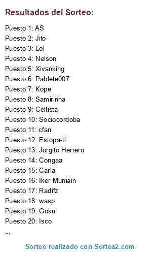 Lista de participantes: Goku, Nelson, Pablo, Krasic, Adrover, Iago Aspas, Jorgito Herrero, Isco, Bromista, Celtista, Rodergas, Congaa, Robbie Keane, DuoKie, Samirinha, Taka, OliverAtom, Rockero2000, Radifz, Dimantes, victor09, Lol, cody, Polako, Jorgele, Pablete007, JorgeMolina, Ricardo Kaká, Safd, AsierVivaGaliza, Miguel17, Soarin, Jito, Estopa-ti, Xivanking, Tintex, FHN, AS, el_vaquero, weiser, cfan, wasp, Nirse, Iker Muniain, Carla, Kope, Sociocordoba, X.