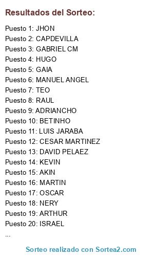 Lista de participantes: RAUL, JORGE, LUIS JARABA, MARCO, DIEGO, DAVID PELAEZ, TORRES FERCHO, SERRANO, KEVIN, GABRIEL CM, HUGO, ADRIANCHO, CASSIANI, OLARTE, MONTOYA, NOGUERA, FERIA, JAIR, JHON, ISRAEL, MANUEL ANGEL, TORTUS, FRANCIS, OSCAR, GAIA, CESAR MARTINEZ, LALO, JOSEPH, MARTIN, NERY, BETINHO, TEO, CAPDEVILLA, ARTHUR, AKIN.