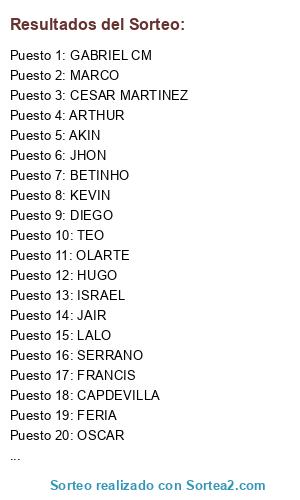 Lista de participantes: RAUL, JORGE, LUIS JARABA, MARCO, DIEGO, DAVID PELAEZ, TORRES FERCHO, SERRANO, KEVIN, GABRIEL CM, HUGO, ADRIANCHO, CASSIANI, OLARTE, MONTOYA, NOGUERA, FERIA, JAIR, JHON, ISRAEL, MANUEL ANGEL, TORTUS, FRANCIS, OSCAR, GAIA, CESAR MARTINEZ, LALO, JOSEPH, MARTIN, NERY, BETINHO, TEO, CAPDEVILLA, ARTHUR, AKIN.