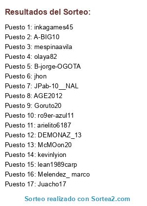 Lista de participantes: inkagames45, mespinaavila, ro9er-azul11, B-jorge-OGOTA, jhon, DEMONAZ_13, kevinlyion, Melendez_ marco, Juacho17, lean1989carp, AGE2012, A-BIG10, JPab-10__NAL, Goruto20, McMOon20, arielito6187, olaya82.