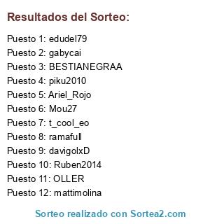Lista de participantes: OLLER, t_cool_eo, ramafull, Ruben2014, davigolxD, mattimolina, BESTIANEGRAA, edudel79, piku2010, gabycai, Ariel_Rojo, Mou27.